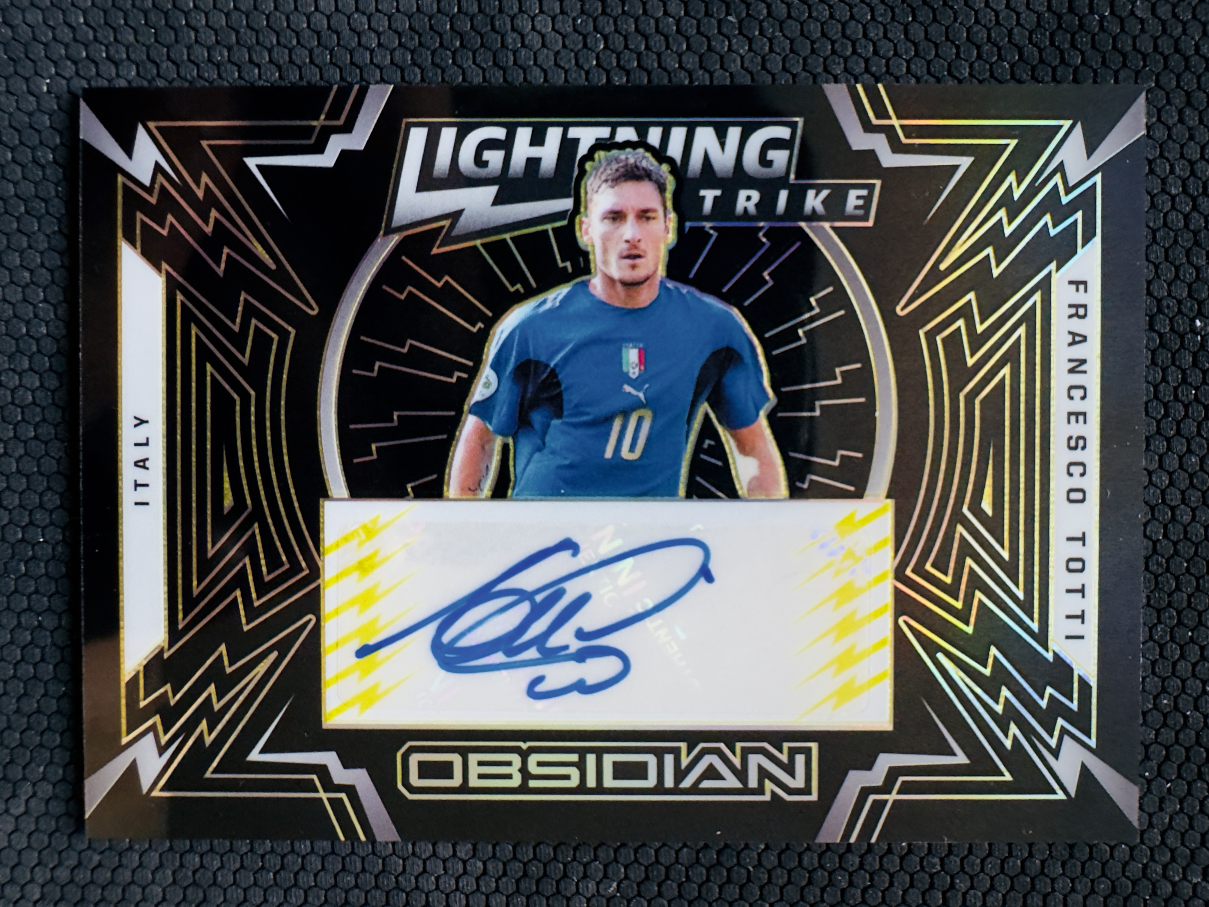 2021-22 Panini Obsidian Francesco Totti 黑曜石 意大利国家队 意甲 罗马传奇 狼王 托蒂 5/10编 同背号编 黑闪电折黑折折射 完美签字签名 皮尔洛布冯皮耶罗
