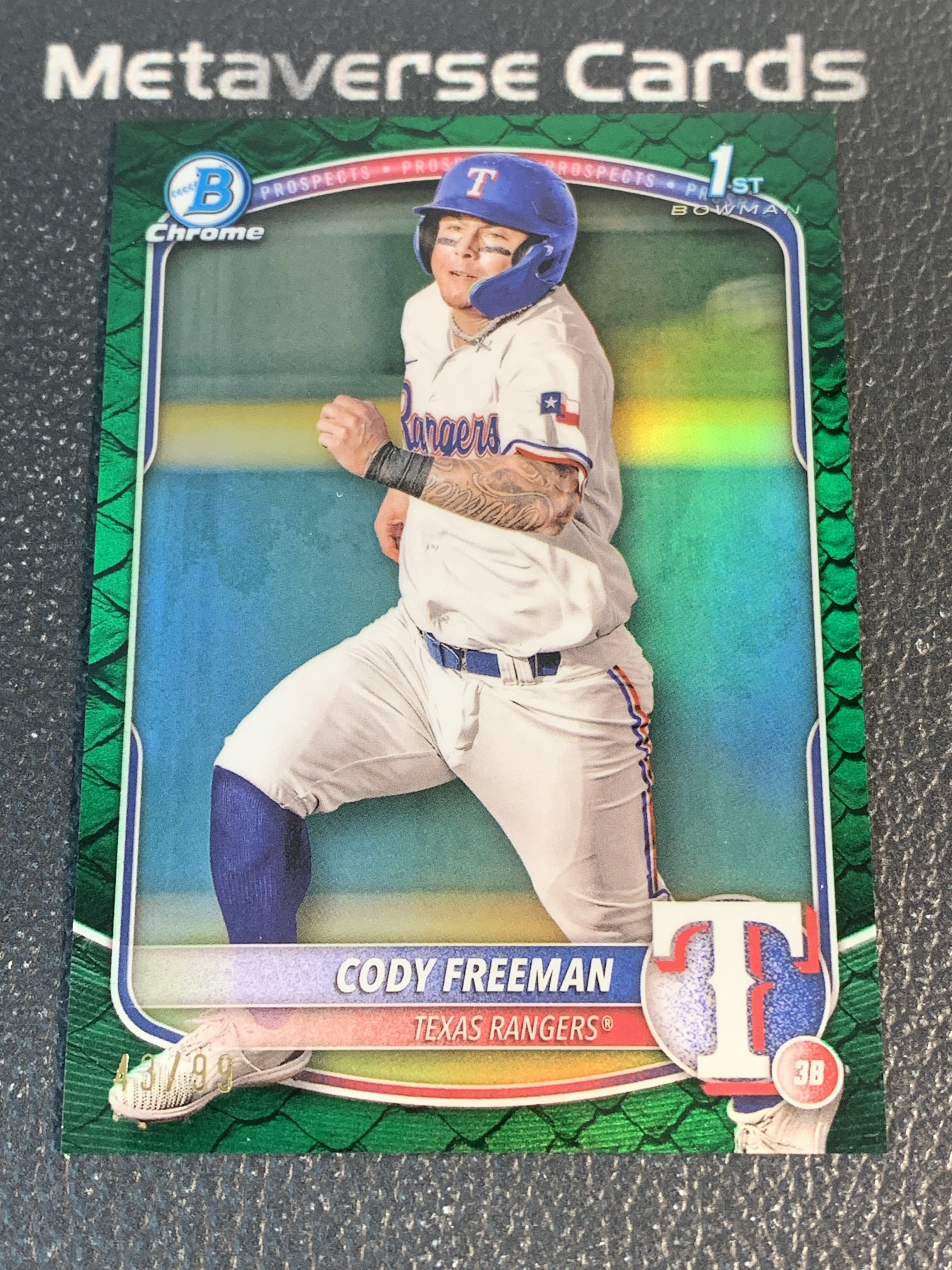 【元宇宙拍卖】垂柳树145:2025 Topps Bowman Chrome Cody Freeman 棒球 科迪 弗里曼 德州游骑兵 1st 绿蛇皮折 43/99编 微瑕如图 专收收藏必备