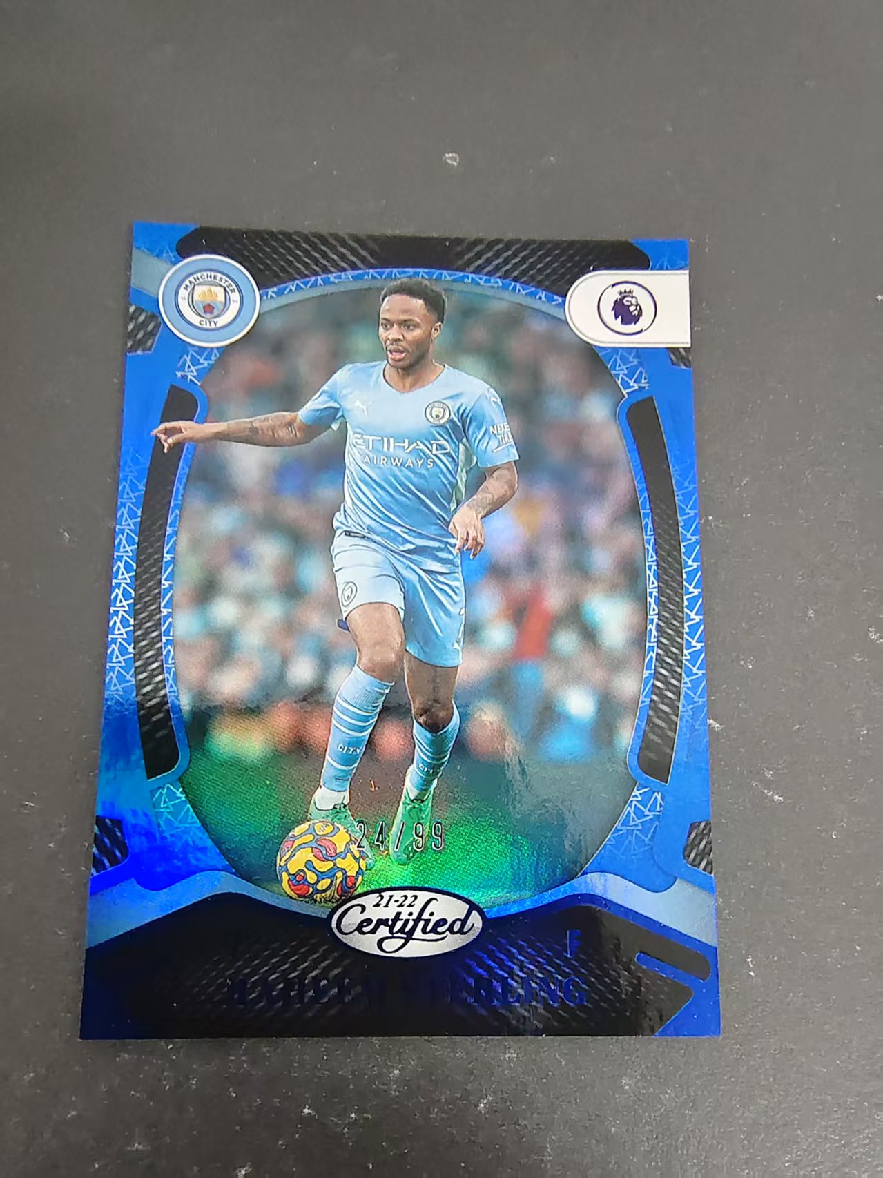 【汽水拍卖】2021-22 Panini Chronicles Raheem Sterling 拉希姆 斯特林 卫生巾 编年史 曼城 英格兰 99编 蓝折 边角瑕疵