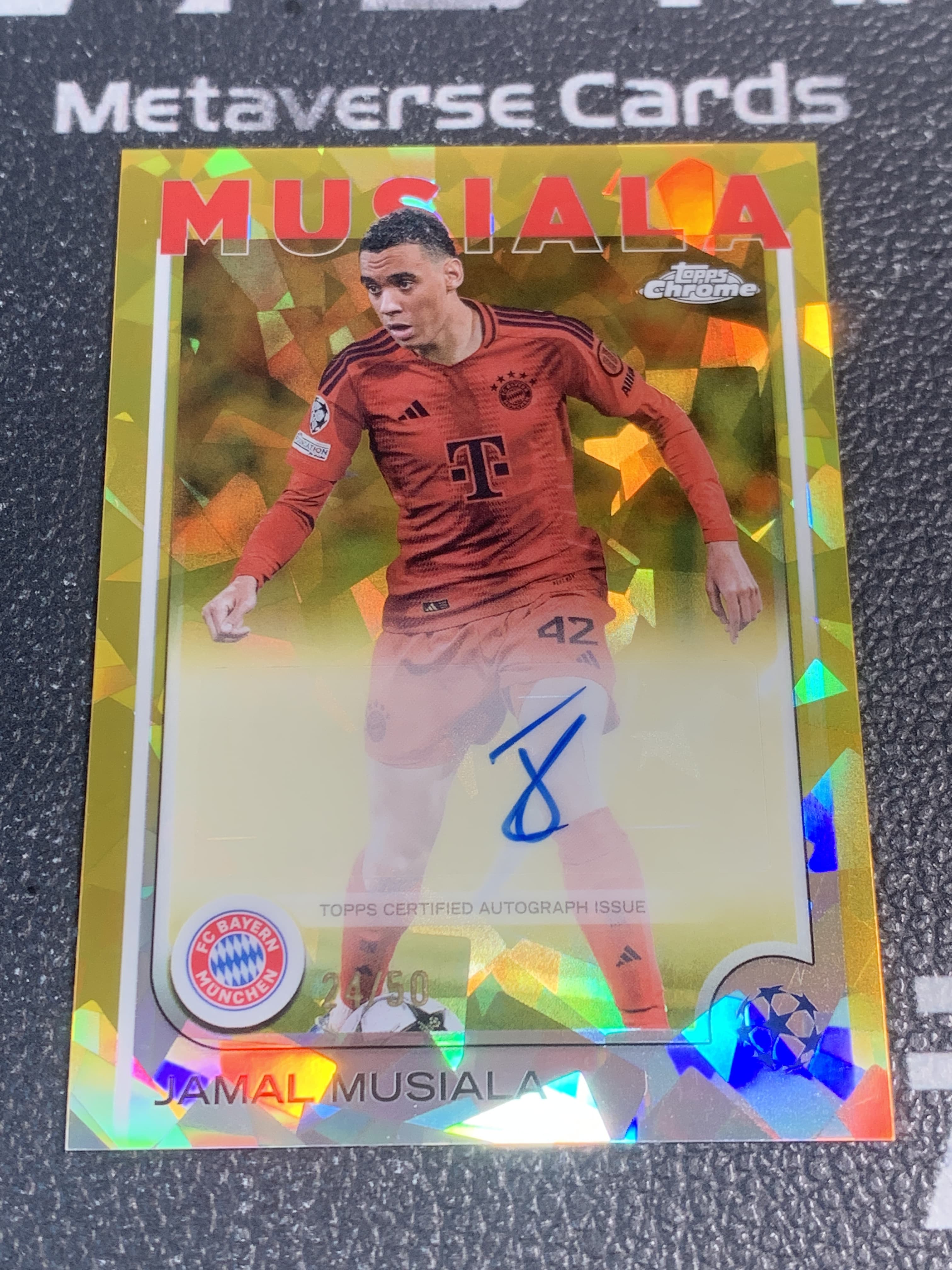 【元宇宙拍卖】皮大衣411:2024-25 Topps Chrome Sapphire UCC Jamal Musiala 拜仁 德国 穆西亚拉 穆夏拉 欧冠TC蓝宝石 限量 金碎冰折 金折 折射 签字 签名 24/50 微瑕如图