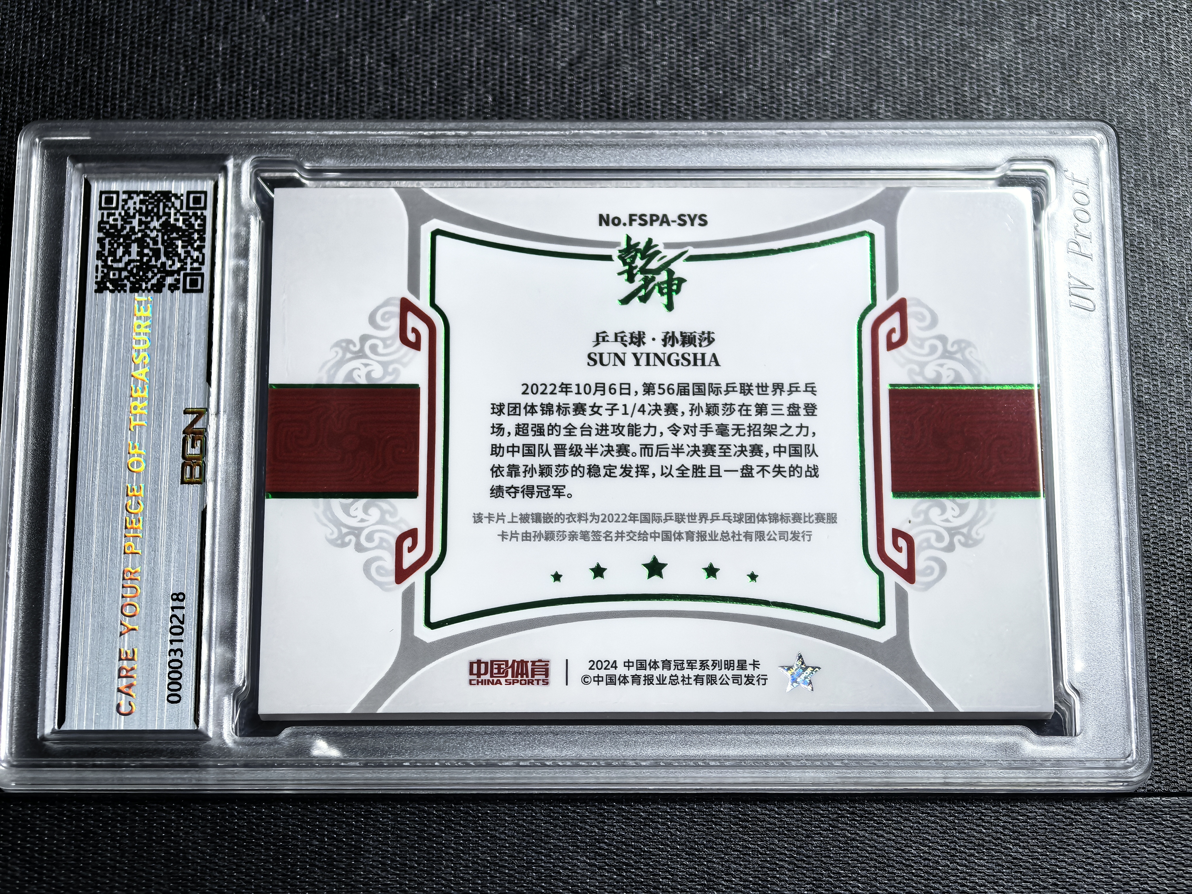 2024中国体育乾坤系列孙颖莎亲笔签字卡,编号3/5,绿色Future Star Future Star Patch版本。带2022年国际乒联世界乒乓球锦标赛比赛服物料切割,品相完好。BGN评级9分,签名10分清晰自然。特殊商品,售出不退不换。有意者请联系,支持顺丰包邮。