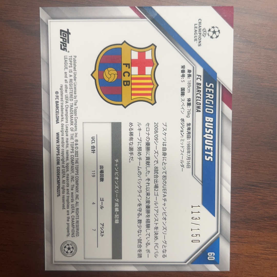 2022 Topps Chrome Sergio Busquets 欧冠 巴塞罗那 巴萨 名宿 布斯克茨 150编 金mojo折 日版 带编 折射 卡品如图