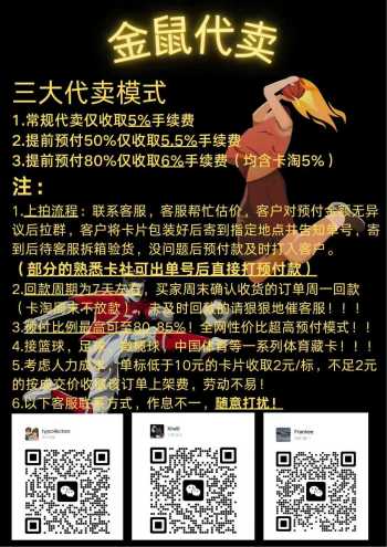 1:金鼠代卖 模式一:正常上拍,只收取卡淘5%,卡淘回款后立即结算,预计7天 模式二:提前预付50%,卡片寄到后确认无误即可打款,收取5.5%(含卡淘费率),买家确认收货后立即结算回款 模式三:提前预付80%,卡片寄到后确认无误即可打款,收取6%(含卡淘费率),买家确认收货后立即结算回款。 注:卡淘回款周期一般为截标后卖家付款确认到货后为准;有需要代卖联系客服微信:Timeless811Khalil; 2:运费问题: (1).上海仓除部分偏远地区到付外,江浙沪地区15元,其余地区快递均统一价18元顺丰空运寄付不到付(包含快递费、包装费、人工费),若不接受请勿拍请勿拍请勿拍 (2).广东仓除港澳台等地区到付外,订单未满1000均统一价12元中通快递发货(包含快递费、包装费、人工费),订单满1000一律顺丰寄付18元,不改到付,介意的勿拍 3:拍品不累积,不累积,不累积!!!如需合并订单请后台私信,合并后请于截标后3天内付款,之后会按照默认地址发出; 4:卡品如展示图所示,默认通行品相(厚卡异形卡老卡白边白角,折射卡印刷线等均属常见情况),有明显瑕疵会在图片中拍出,卖家出价前请务必看清,不接受中标后没看到其他图片中拍出瑕疵的借口,完美主义者请拍已评级的卡,如卡品有瑕疵且超出通行品范畴未拍出,请开箱时录视频为证并非买家自己失误导致,评级卡不再讨论卡品问题,lot的卡片不保卡品卡具,单卡低于10元不保卡具,单卡高于10元或带编卡片保卡膜和夹 5:卡友们有任何问题请私信留言,欢迎关注;玩卡开心第一位,愿大家都可收到自己喜欢的卡。