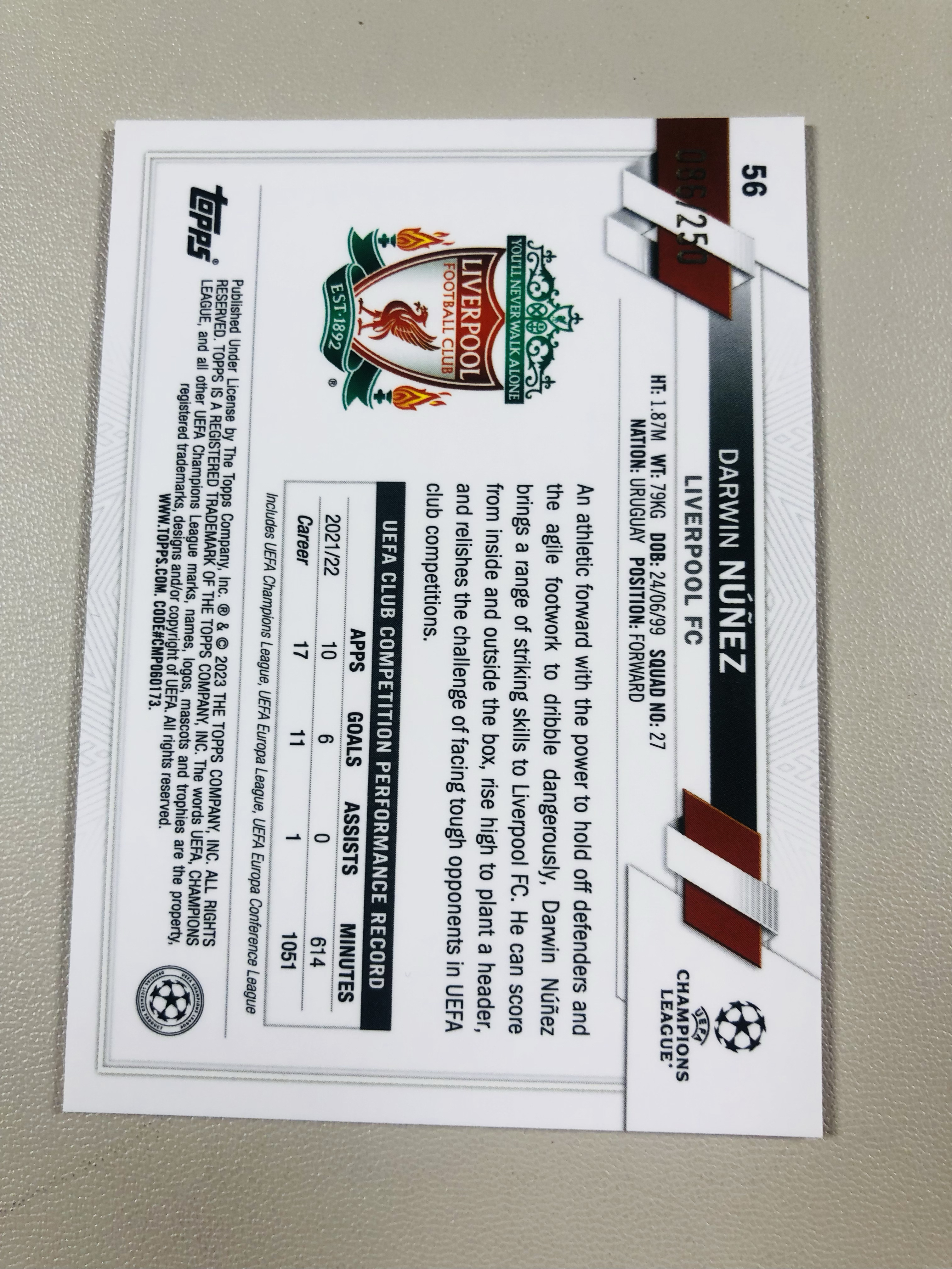 2023 Topps Chrome Darwin Nunez 欧冠 Chrome 利物浦 努涅斯 086/250编 实卡精美投资收藏俱佳 NF0923