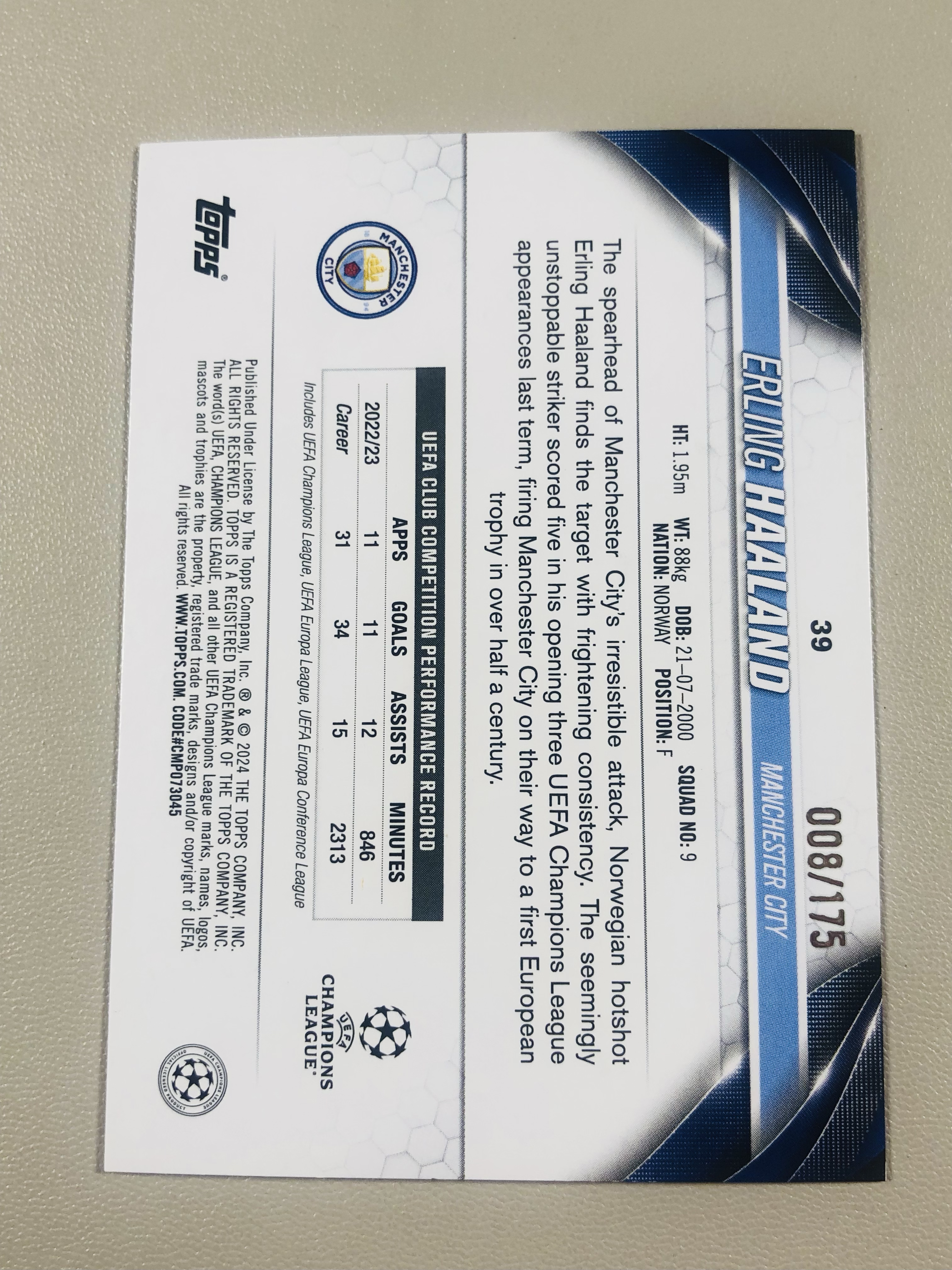 2024 Topps UCC Erling Haaland 欧冠 UCC 碧玉 曼城 哈兰德 008/175编 实卡精美投资收藏俱佳 NF0923