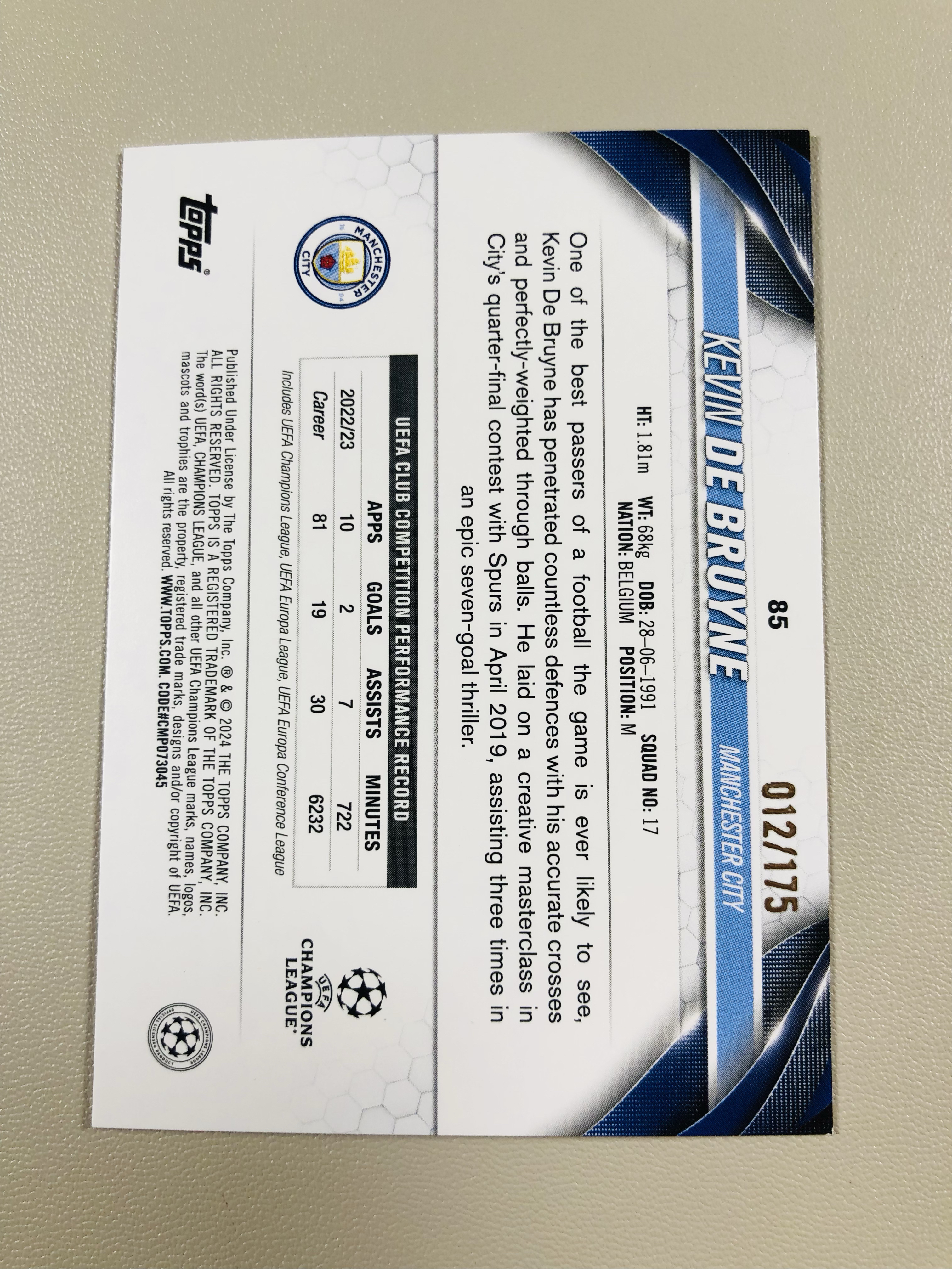 2024 Topps UCC Kevin De Bruyne 欧冠 UCC 碧玉 曼城 德布劳内 限量 /175编 实卡精美投资收藏俱佳 刘哥0924