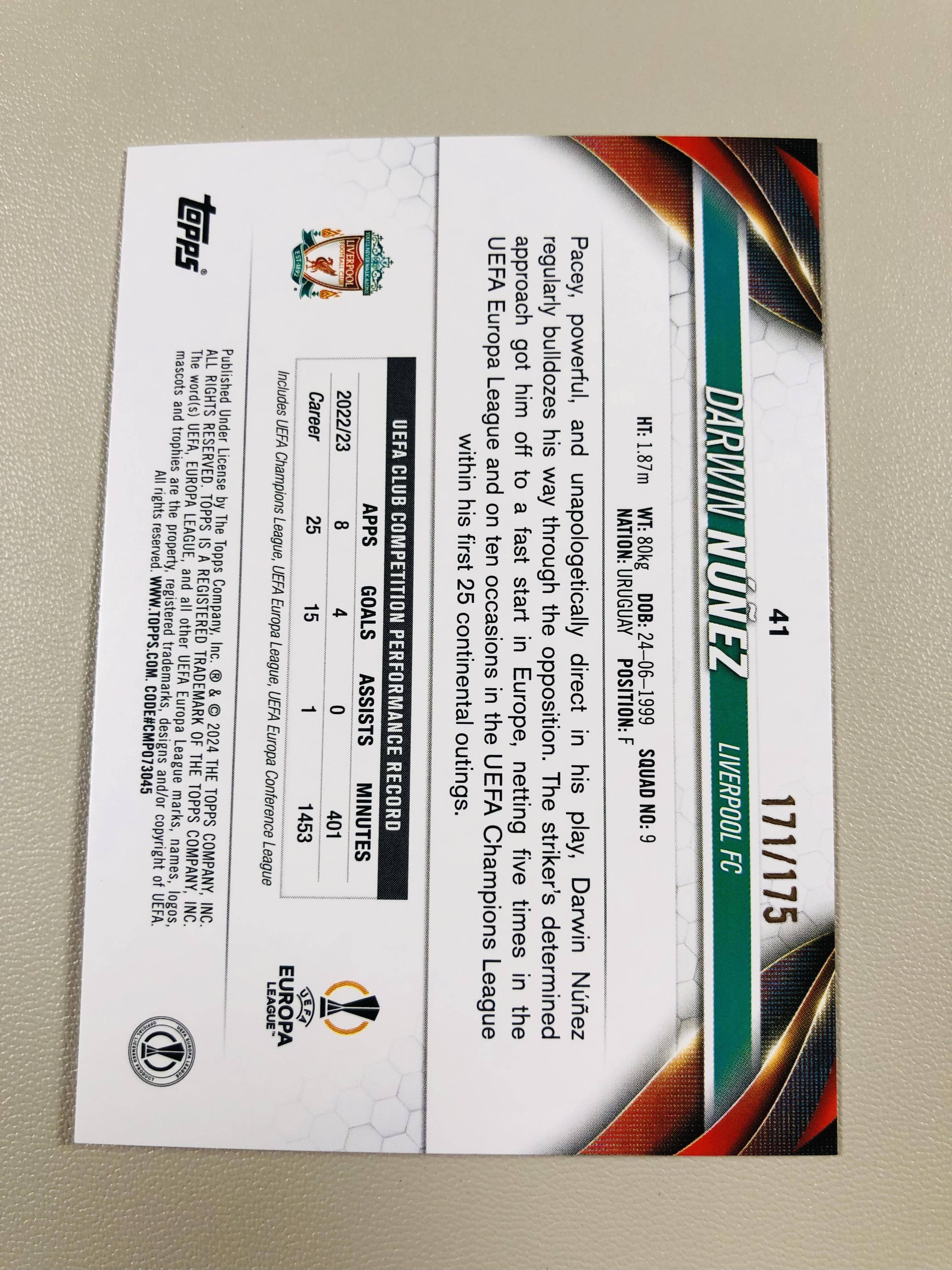 2024 Topps UCC Darwin Nunez 欧冠 UCC 碧玉 利物浦 努涅斯 限量 /175编 实卡精美投资收藏俱佳 刘哥0924