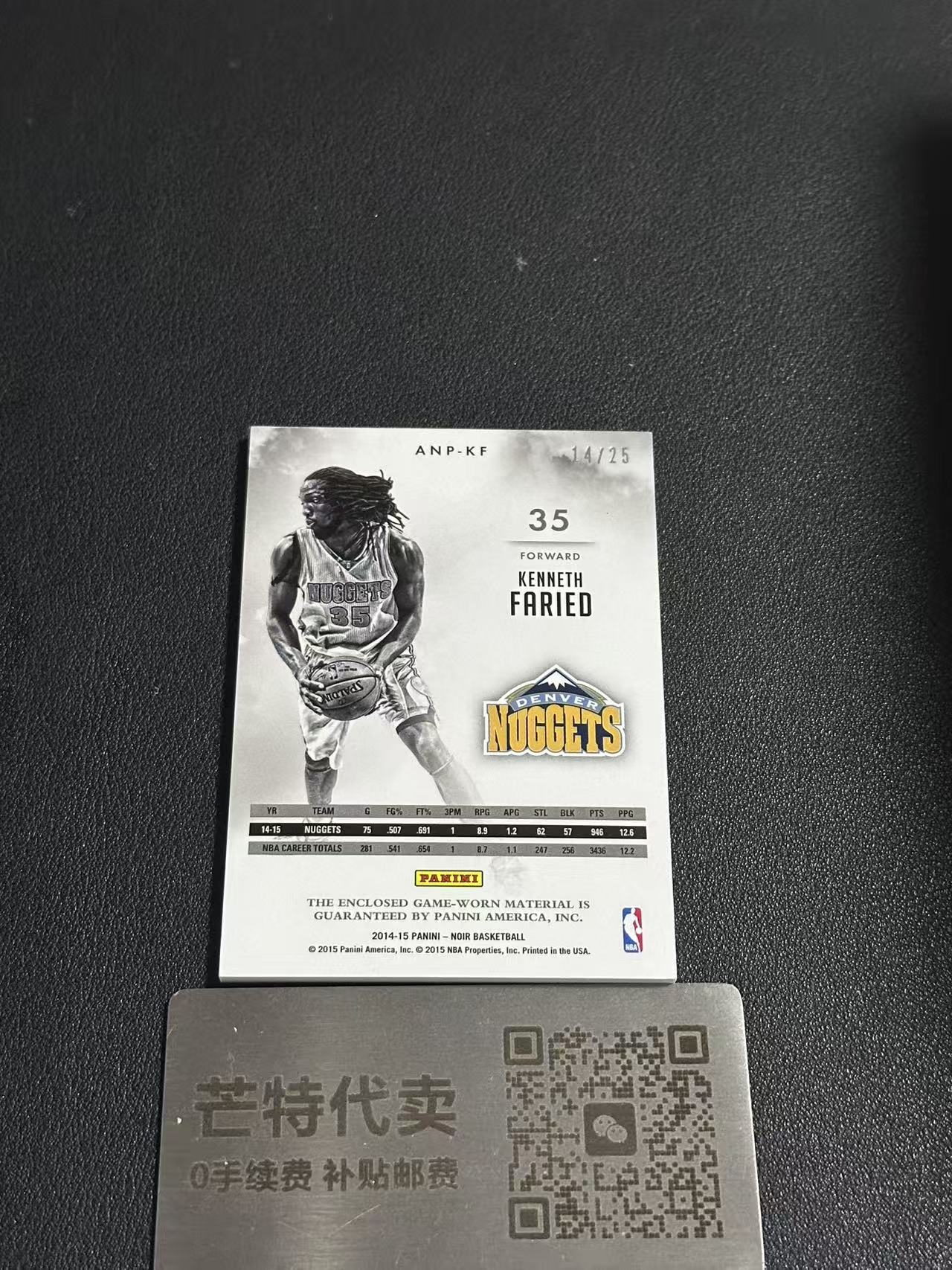 【芒特代卖】 2014-15 Panini Noir Kenneth Faried 诺尔 掘金 法里埃德 半兽人 25编 镜面 patch 补丁 球衣 实物 (YYY)