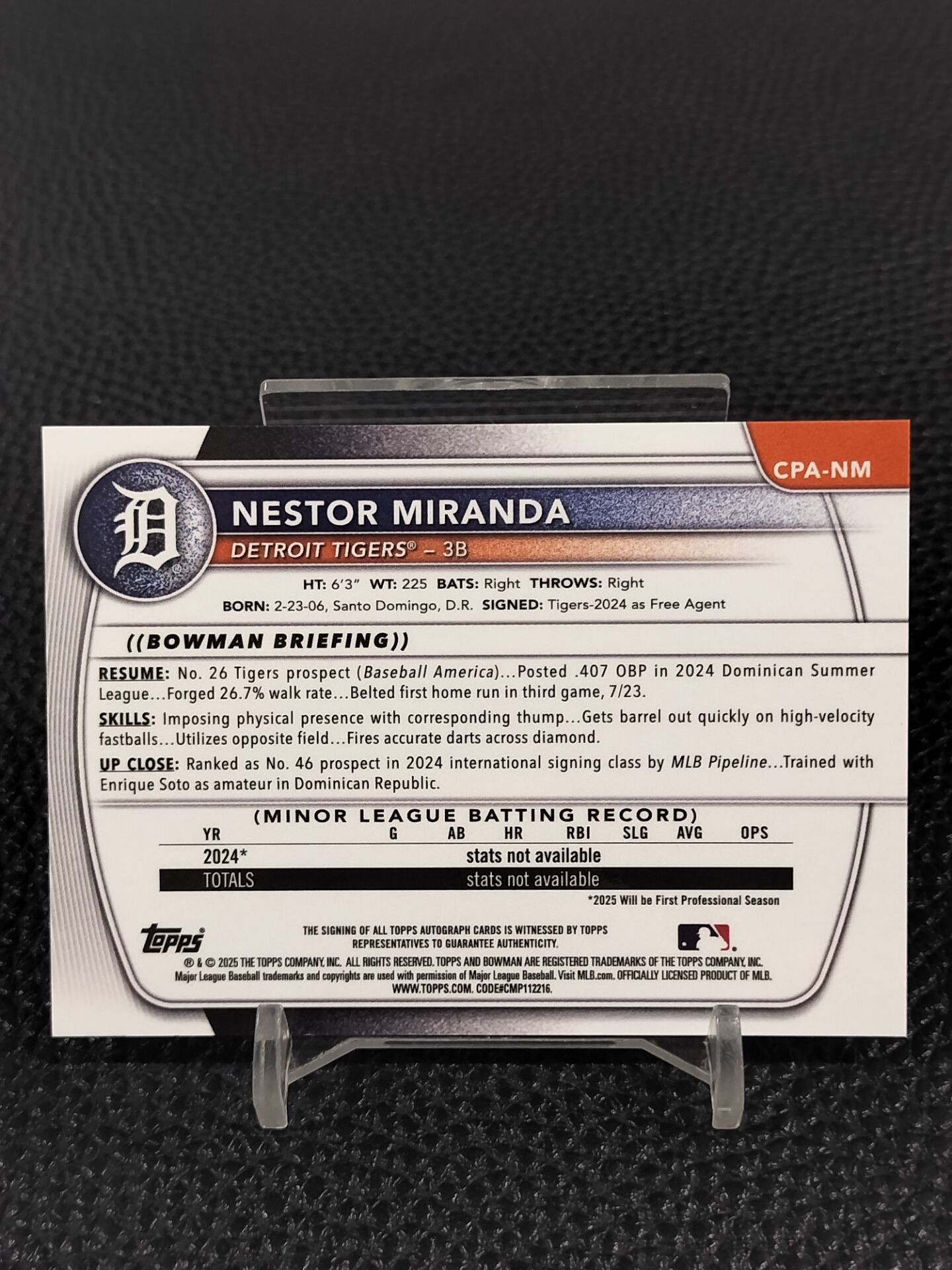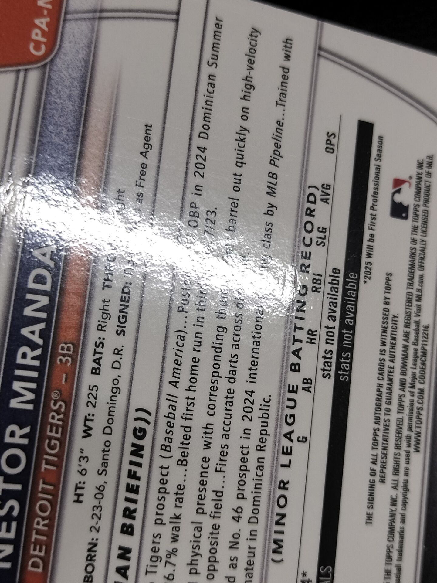 【浩行拍卖 截标预付82%】2025 topps bowman chrome nestor miranda 底特律老虎 内斯特 米兰达 1st 新秀rc 签字 卡签 碎点折 折射 140/299编 专收必备 瑕疵看图「双语」1011h01飛