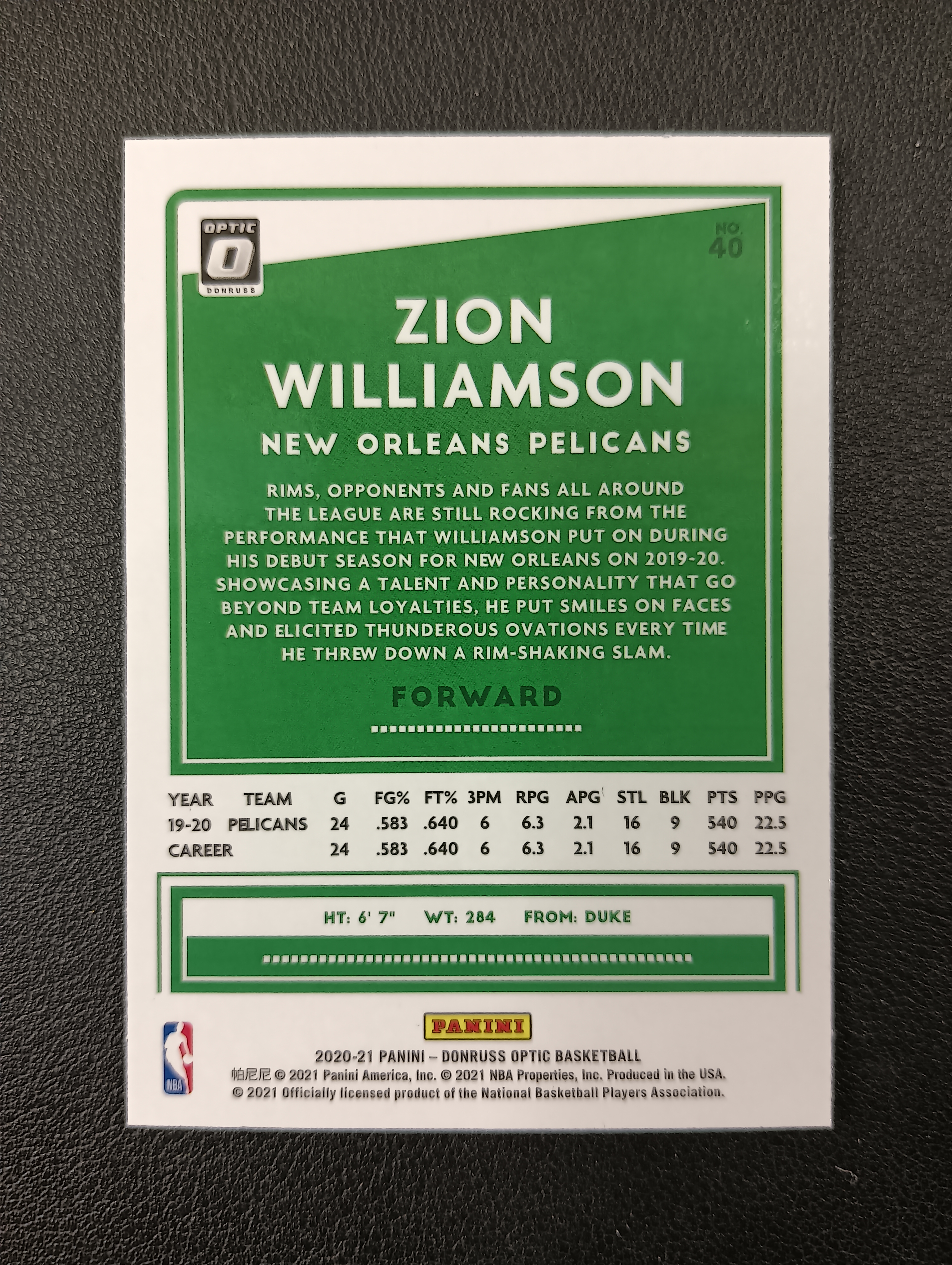 2020-21 PANINI 杜蕾斯OPTIC ZION WILLIAMSON 【卡仓-闪电065】鹈鹕 蔡恩威廉森 锡安 胖虎 BASE NO.40