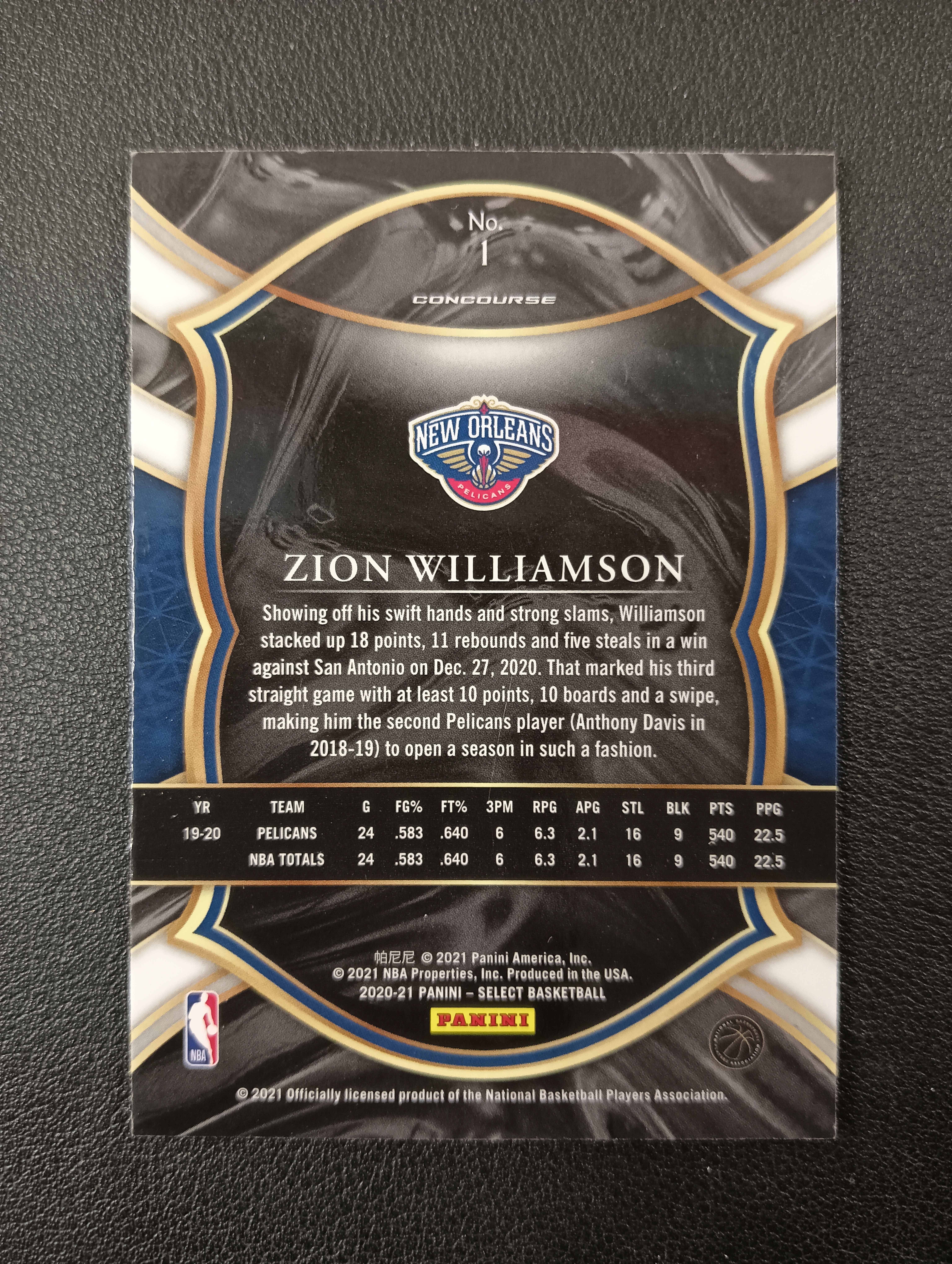 2020-21 PANINI SELECT ZION WILLIAMSON 【卡仓-闪电065】鹈鹕 蔡恩威廉森 CONCOURSE 一级BASE NO.1