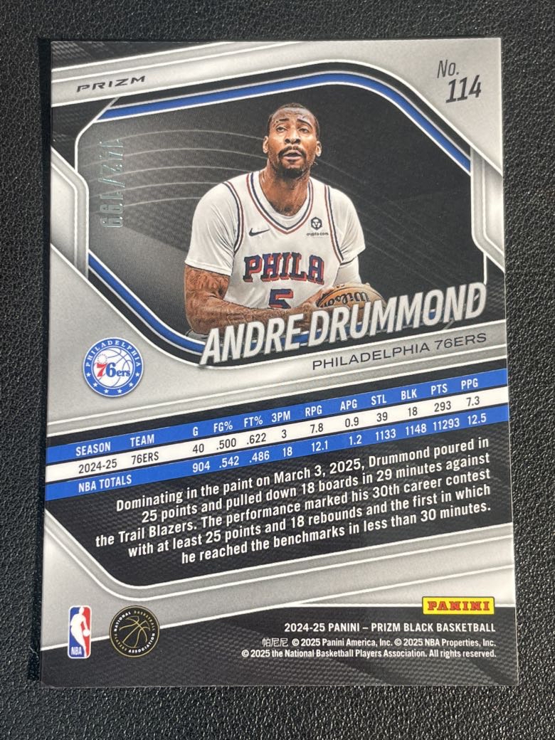 2024-25 Panini Prizm Black Andre Drummond 499 安德烈 德拉蒙德 76人 折射 蓝折 199编 实卡精美 卡品如图 尖叫代拍 pink