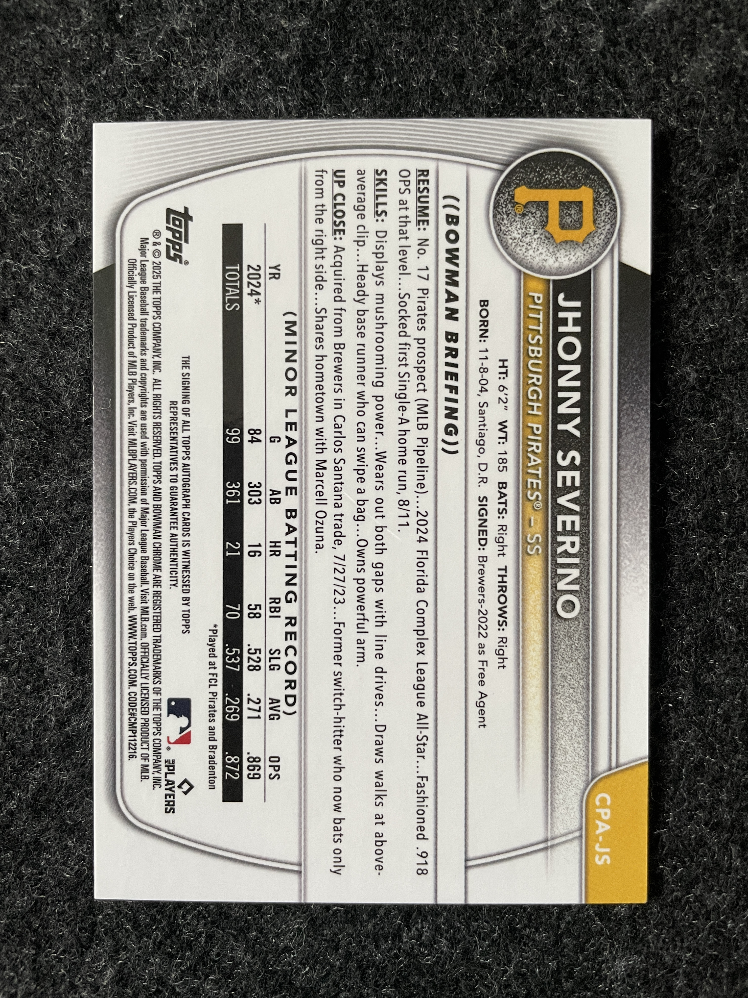 【阿木代拍211医生】2025 Topps Bowman Chrome 棒球MLB Pirates海盗队 1st首秀新秀 Jhonny Severino 塞维里诺 签字卡签 mojo折 /150编