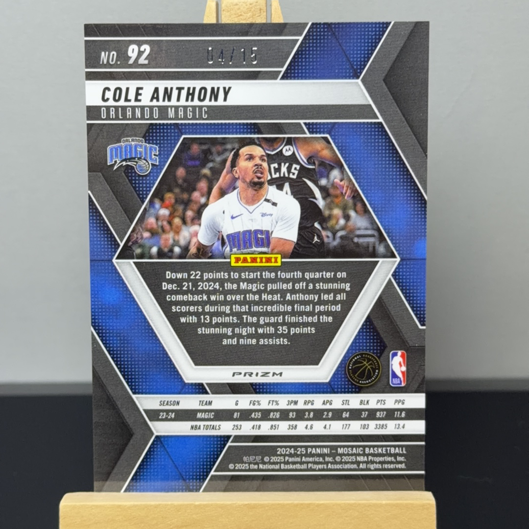 2024-25 Panini Mosaic Cole Anthony 科尔 安东尼 擦哥 魔术 马赛克 绿圈圈折 折射 04/15编 卡品如图 专收必备 凑套必备 鑫