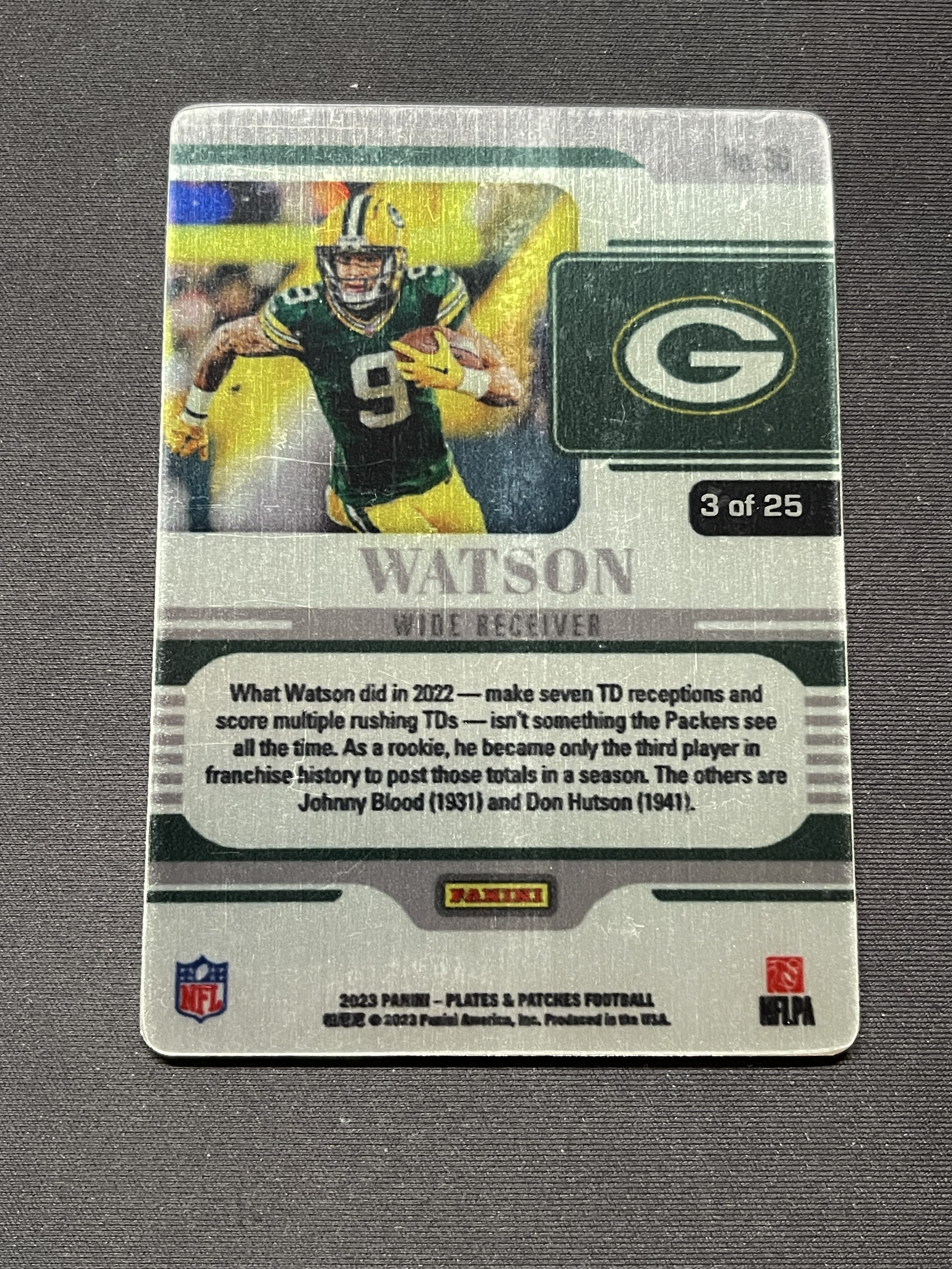 2023 Panini Plates and Patches Christian Watson 绿湾包装工 克里斯蒂安沃特森 铁板 3/25编 街机版 不累计「老夫子」阿宾