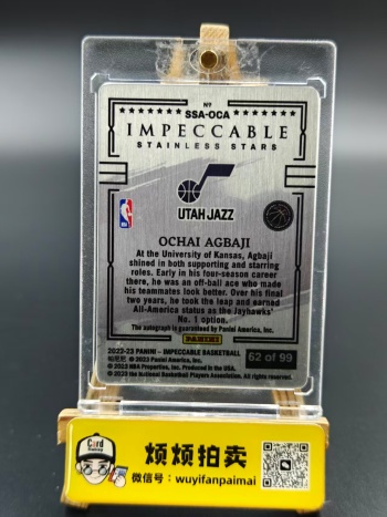 2.参拍:卡品墨迹如图所示(厚卡异形卡等都有正常白边白角,部分系列会有特殊瑕疵),请认真看图后再谨慎出价。不接受任何艺术家买卡,如拍到卡后有任何艺术家行为(包括但不限于在通行卡品里挑瑕疵索要赔偿或退卡等)一律拉黑投诉处理。所卖卡未经描述均为通行品,可能会有细微瑕疵;打包标小卡可能会有不同程度的瑕疵,不保障卡品;评级卡壳和原封砖的磨损不包含在卡品范围内;多张上拍卡品通行的同款卡片随机发货。竞拍前可以私聊要细节图,成交后再以有瑕疵、勿拍等理由退卡的一律拒绝,介意者请勿参拍!参拍即视为已读同意!