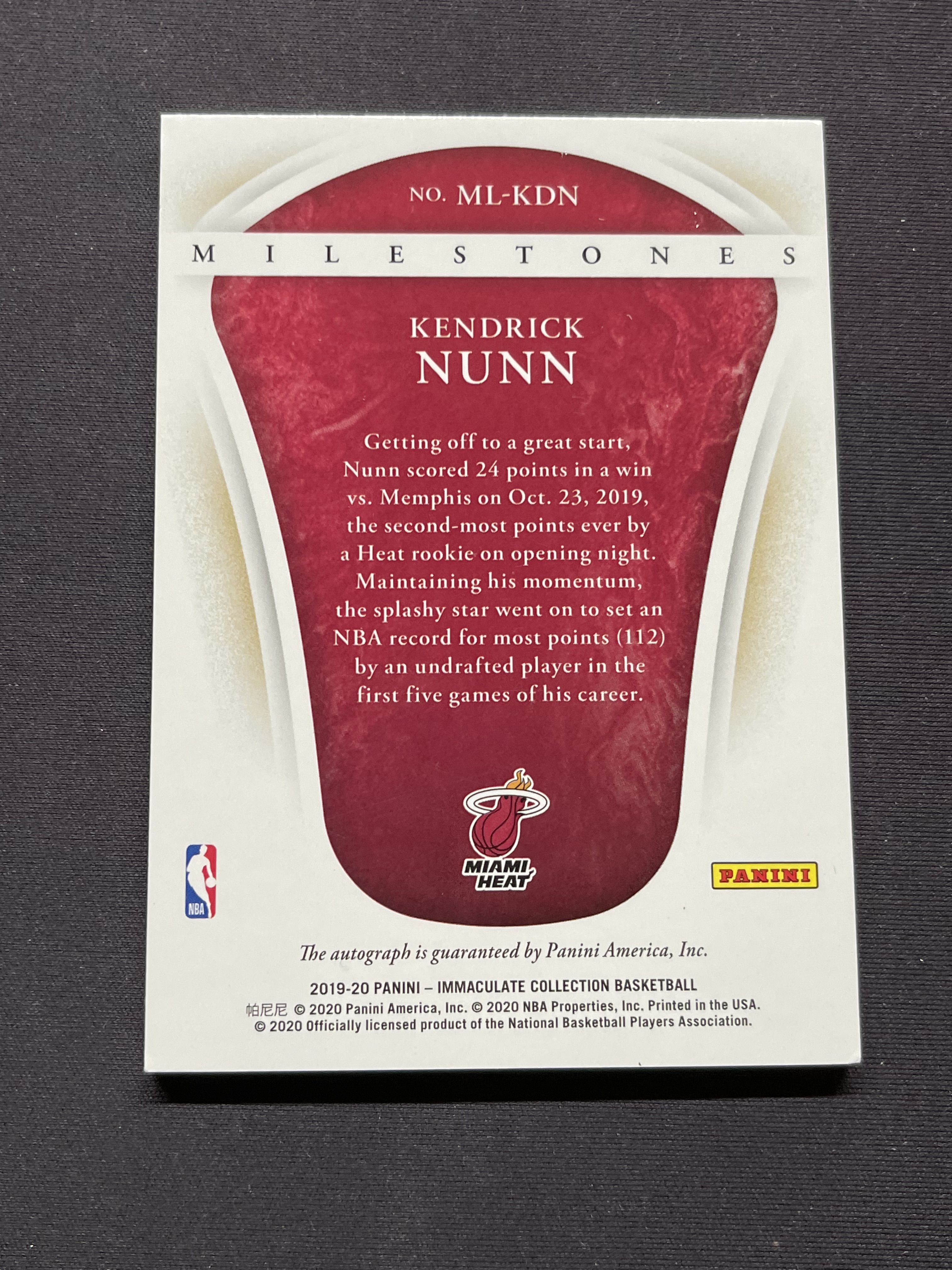 2019-20 Panini Immaculate Kendrick Nunn RC 热火 肯德里克纳恩 新秀 镜面 Milestones 里程碑 签字卡签 11/25编 瑕疵如图「老夫子」123