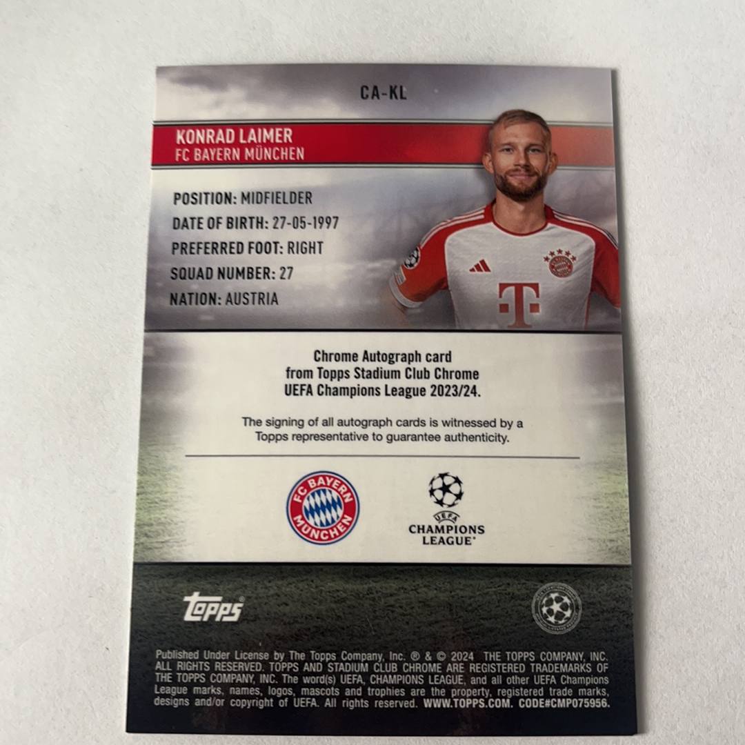 2024 Topps Stadium Club Chrome Konrad Laimer 欧战竞技场 拜仁慕尼黑 康拉德 莱默尔 莱莫 签字 银折签 细节如图 收藏必备 ooh