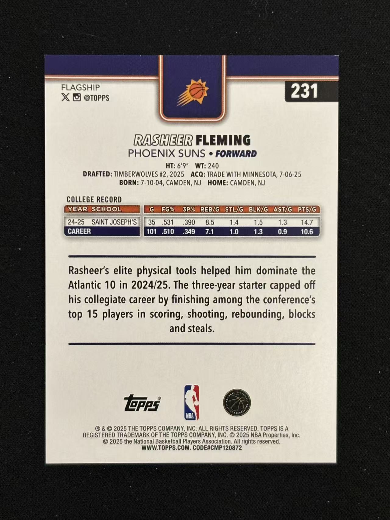 2025 Topps flagship Rasheer Fleming RC 拉希尔 弗莱明 新秀 黑折 01/10编 - Sasha