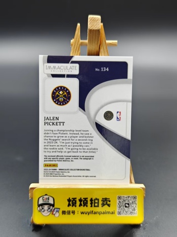 2.参拍:卡品墨迹如图所示(厚卡异形卡等都有正常白边白角,部分系列会有特殊瑕疵),请认真看图后再谨慎出价。不接受任何艺术家买卡,如拍到卡后有任何艺术家行为(包括但不限于在通行卡品里挑瑕疵索要赔偿或退卡等)一律拉黑投诉处理。所卖卡未经描述均为通行品,可能会有细微瑕疵;打包标小卡可能会有不同程度的瑕疵,不保障卡品;评级卡壳和原封砖的磨损不包含在卡品范围内;多张上拍卡品通行的同款卡片随机发货。竞拍前可以私聊要细节图,成交后再以有瑕疵、勿拍等理由退卡的一律拒绝,介意者请勿参拍!参拍即视为已读同意!