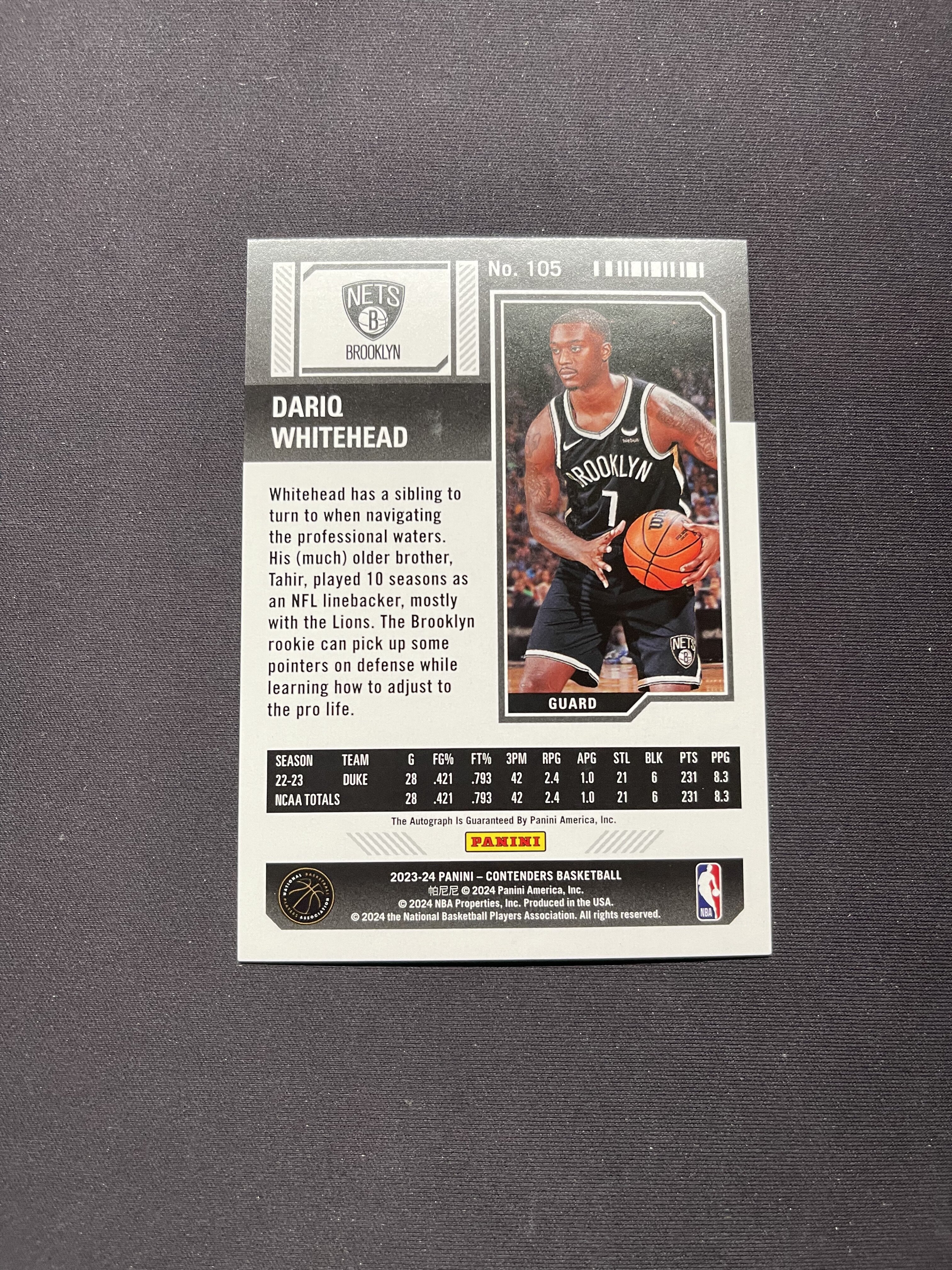 2023-24 Panini Contenders Dariq Whitehead RC 球票 篮网 怀特黑德 新秀 碎冰折 签字卡签 折射 05/25编 不累计「老夫子」ju050