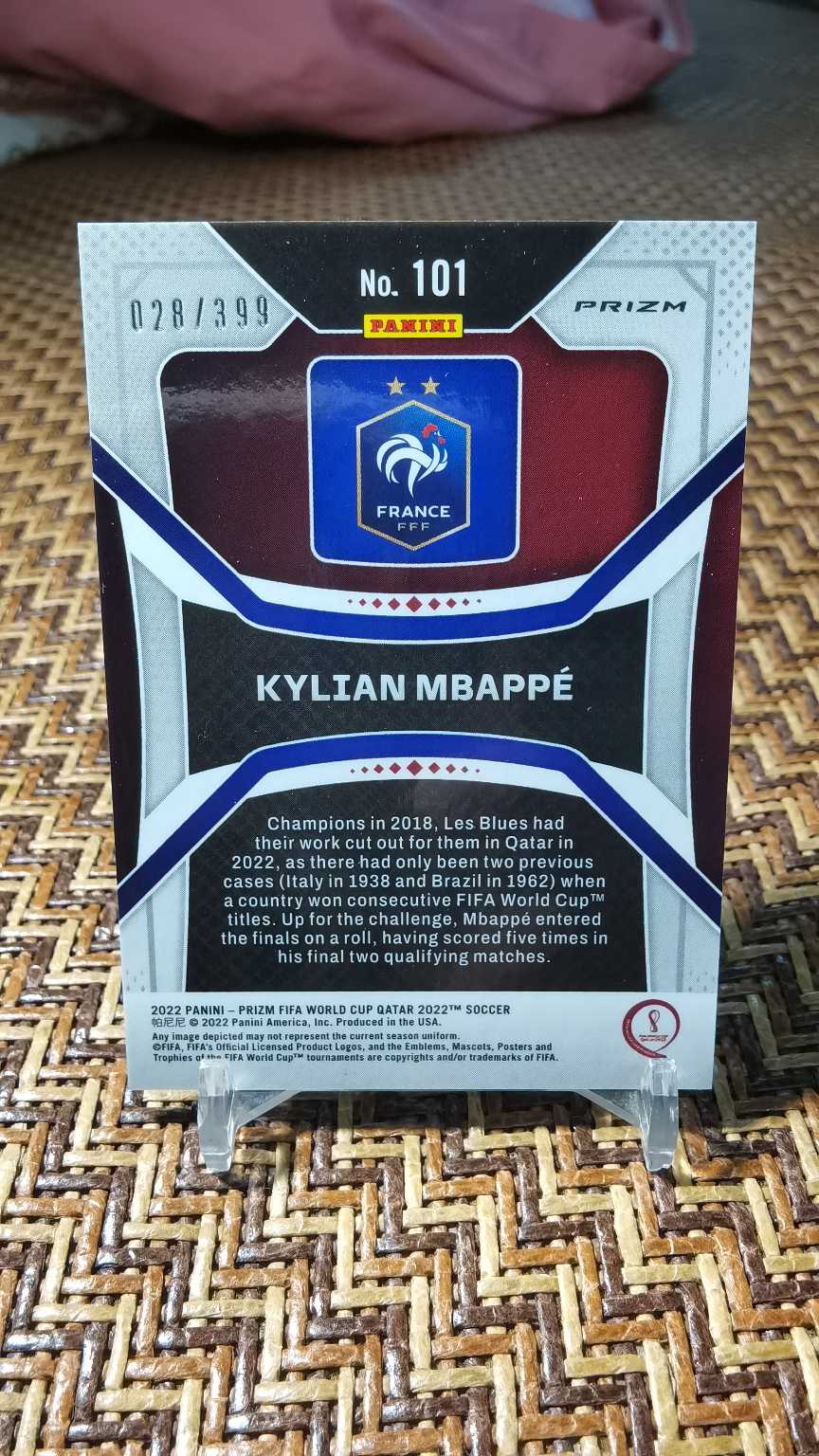 2022 Panini World Cup Prizm Kylian Mbappe 世界杯PZ 基利安姆巴佩 028/399编 红折 法国 皇家马德里 黄马 实卡精美 收藏必备 卡品如图