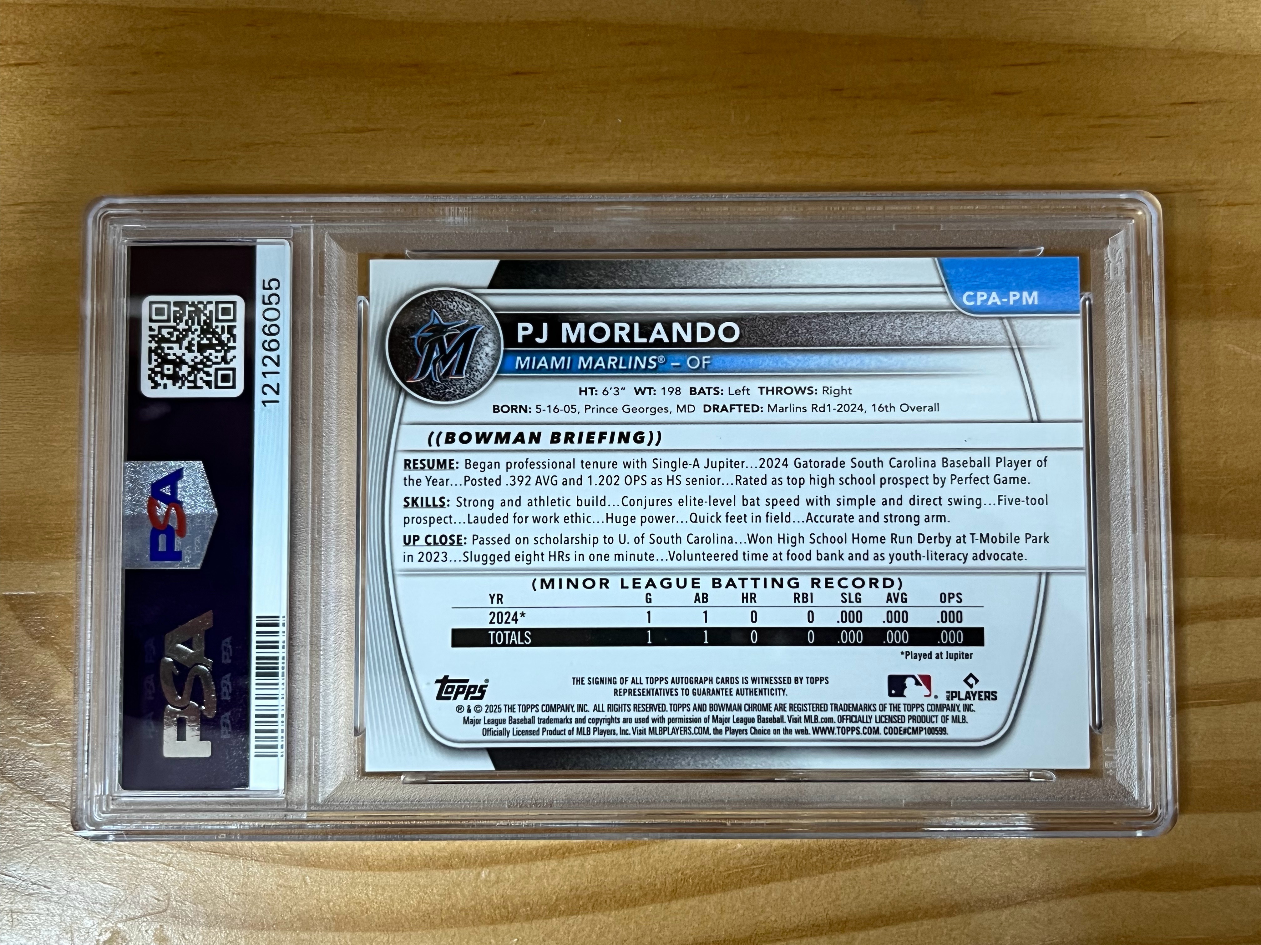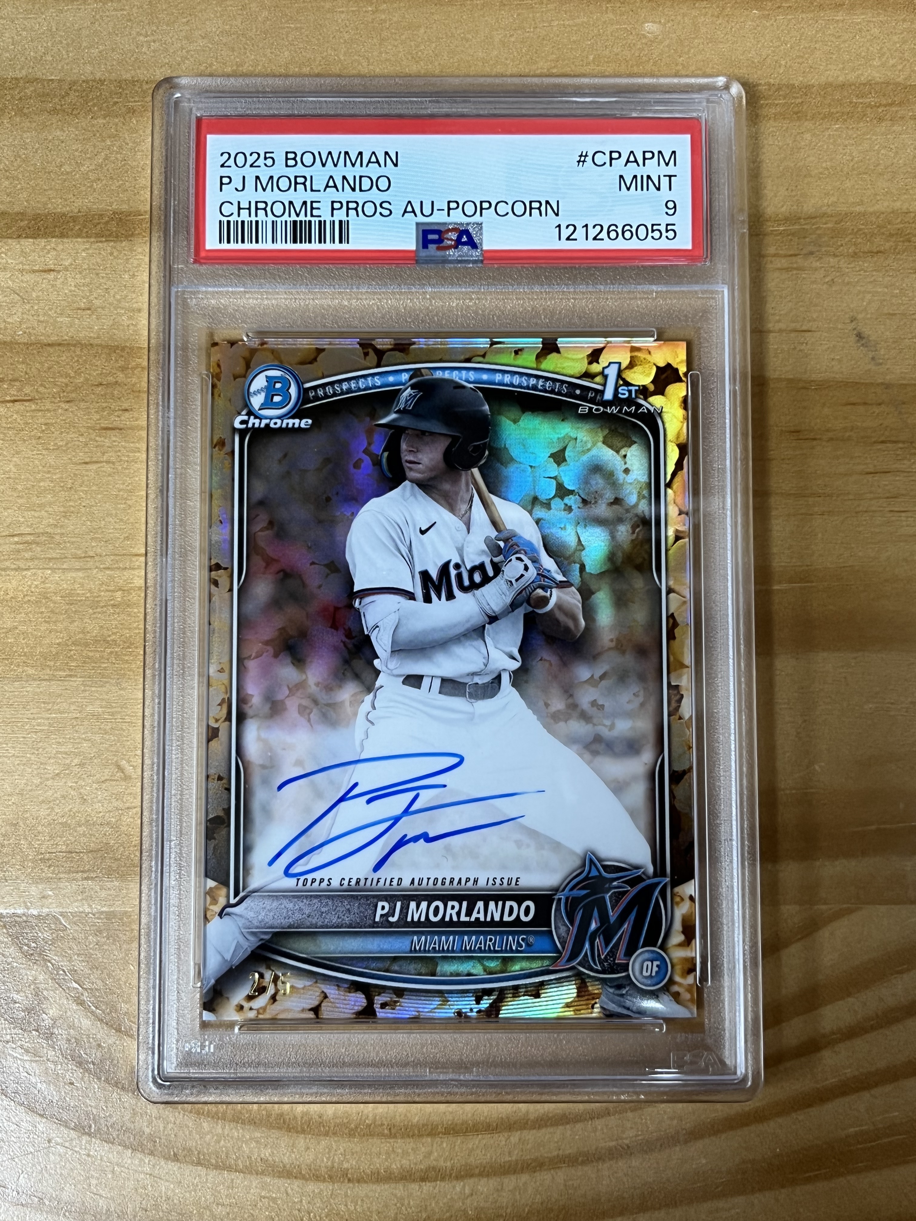 2025 BOWMAN CHROME 迈阿密马林鱼 pj morlando  PJ 莫尔兰多 新秀  1ST popcorn  爆米花折签字卡  卡签  2/5 PSA评级 9分   花布袋