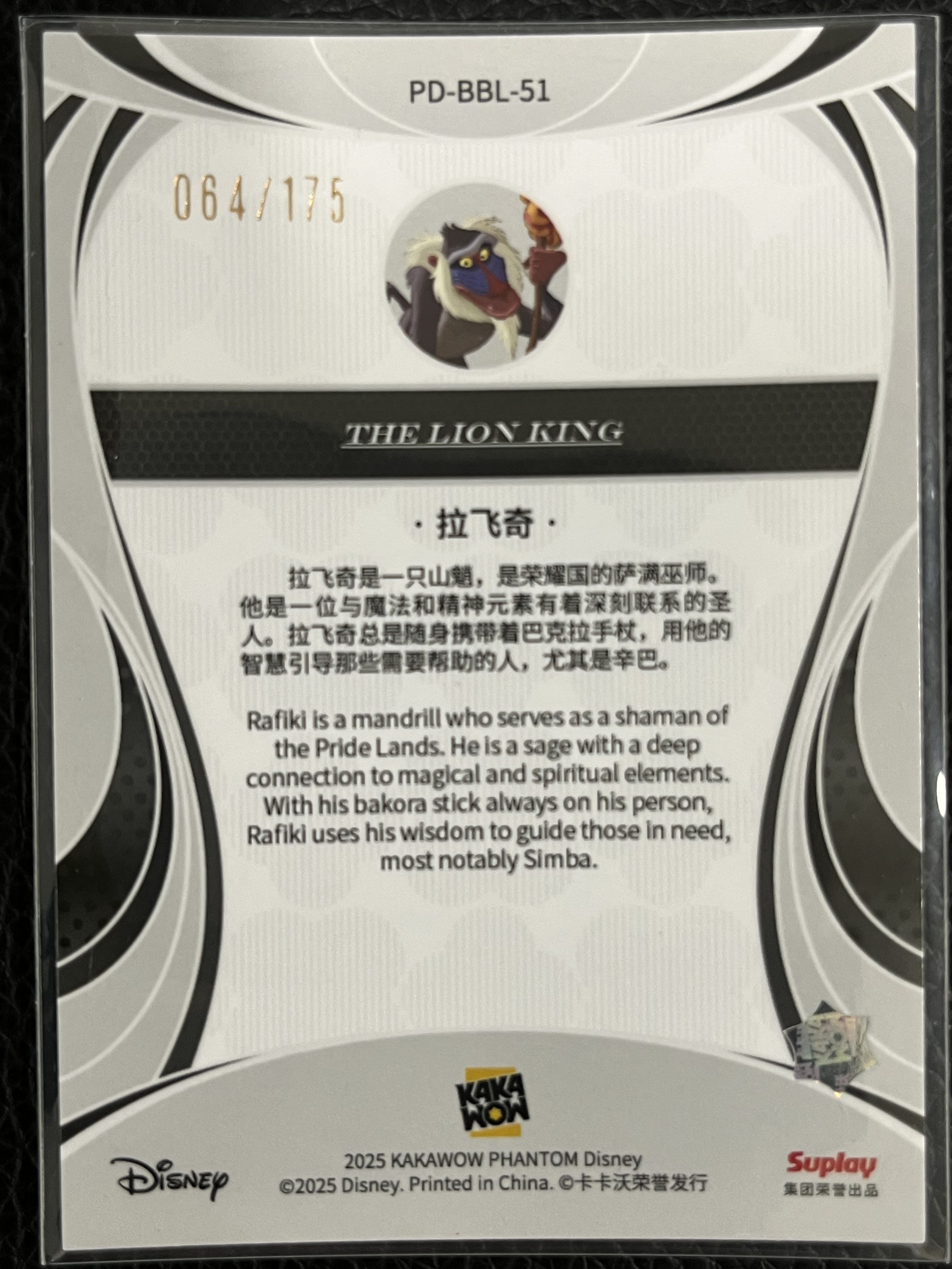 卡卡沃 2025 KAKAWOW PHANTOM 迪士尼系列收藏卡 基础卡-蓝 西GXX(12A)64/175编 卡号51 拉飞奇 Rafiki