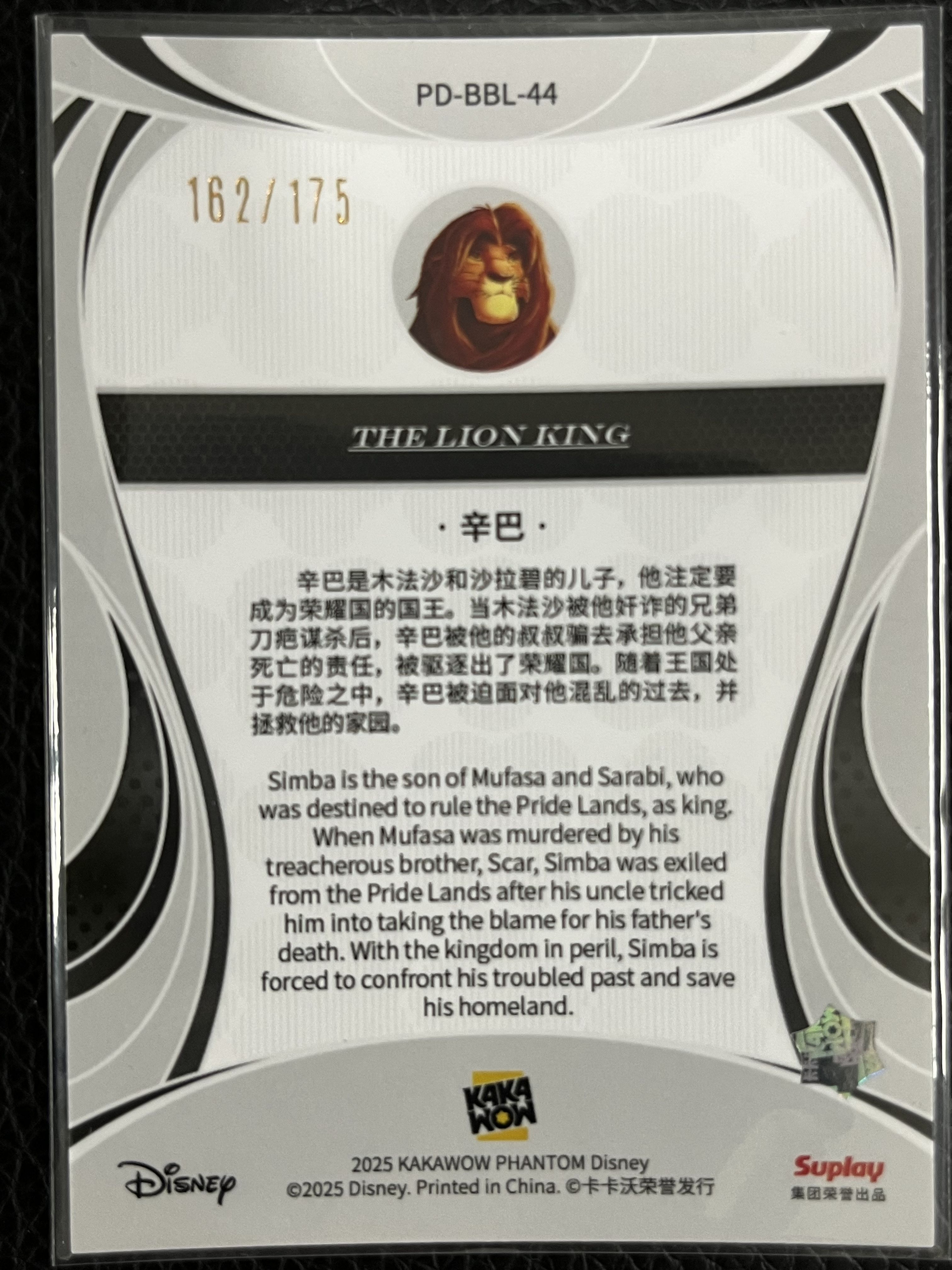 卡卡沃 2025 KAKAWOW PHANTOM 迪士尼系列收藏卡 基础卡-蓝 西GXX(12A)162/175编 卡号44 辛巴 Simba