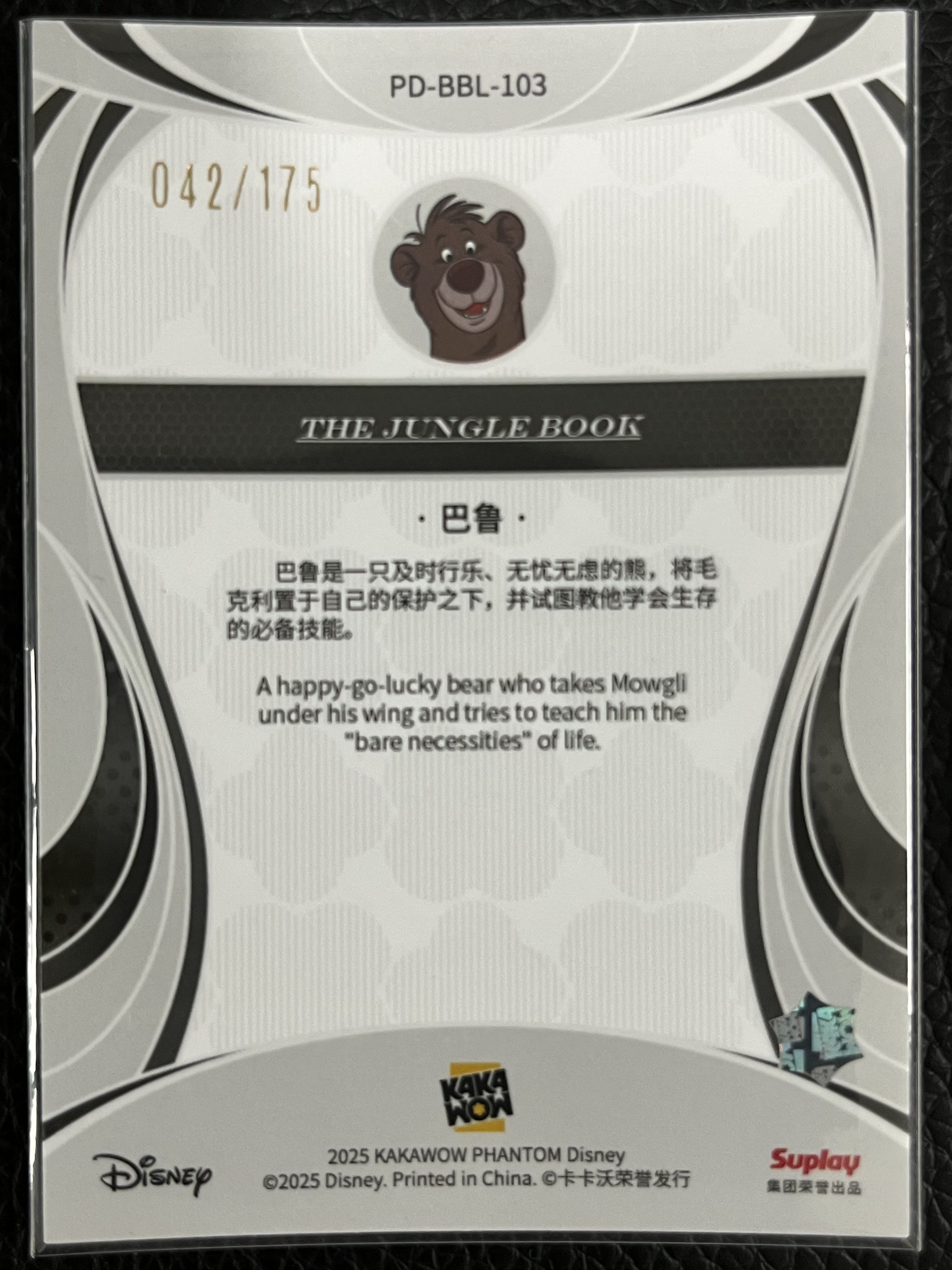卡卡沃 2025 KAKAWOW PHANTOM 迪士尼系列收藏卡 基础卡-蓝 西GXX(12A)42/175编 卡号103 巴鲁 Baloo
