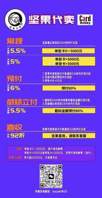 1.发货:【快递一律只发顺丰件!,单卡价值在40元以上的会配备卡夹,图片中有卡砖的会附送卡砖】,运费见运费栏。只发平台默认地址,要转寄的需要先提供提货码。超重的快递会发到付件,可以联系客服退还平台支付的运费;订单只合并三天内的,时间超过三天的订单一律不合并【等待合并订单再付款,如已经付款的就不再合并】;付款了的订单,三天内会默认发出。接受不了以上内容的,请勿竞拍!