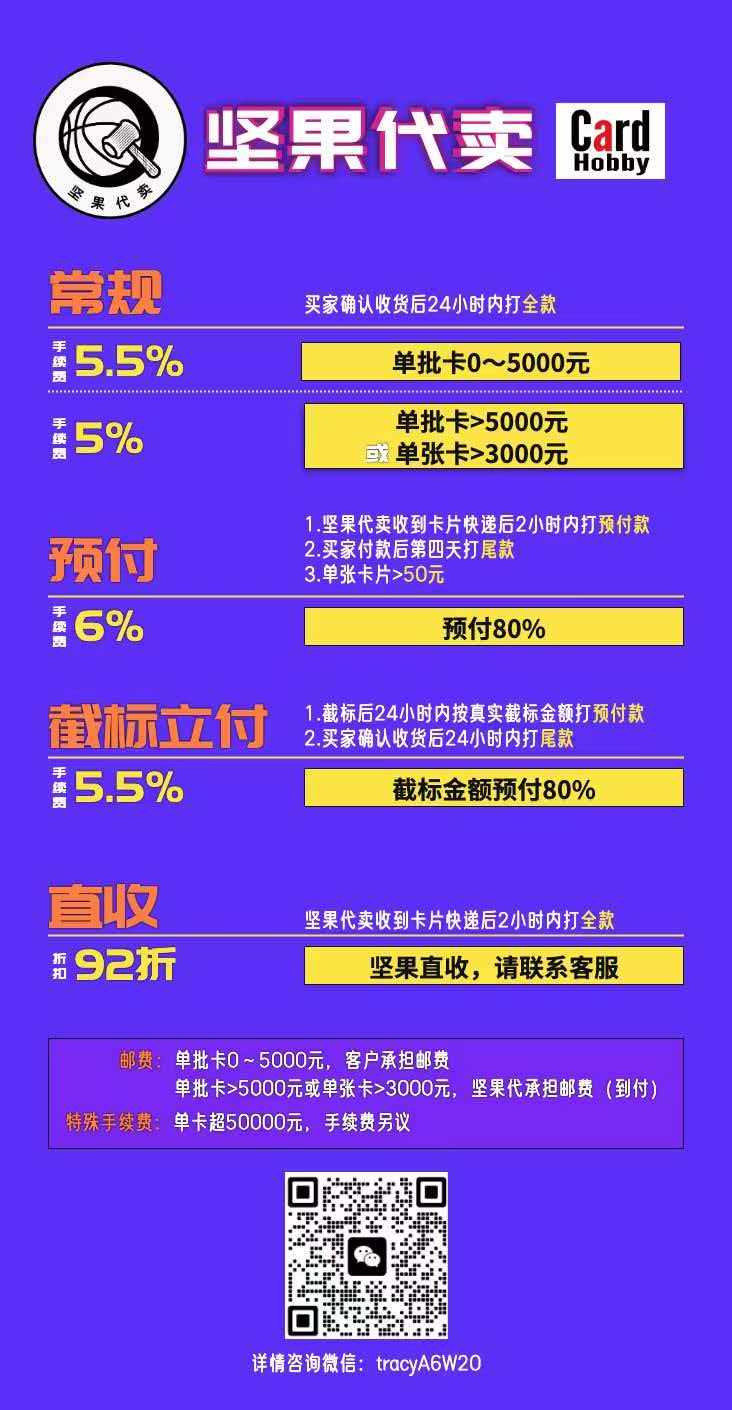 2.参拍:卡品墨迹如图所示(厚卡异形卡等都有正常白边白角,部分系列会有特殊瑕疵),请认真看图后再谨慎出价。不接受任何艺术家买卡,如拍到卡后有任何艺术家行为(包括但不限于在通行卡品里挑瑕疵索要赔偿或退卡等)一律拉黑投诉处理。所卖卡未经描述均为通行品,可能会有细微瑕疵;打包标小卡可能会有不同程度的瑕疵,不保障卡品;评级卡壳和原封砖的磨损不包含在卡品范围内;多张上拍卡品通行的同款卡片随机发货。竞拍前可以私聊要细节图,成交后再以有瑕疵、勿拍等理由退卡的一律拒绝,介意者请勿参拍!参拍即视为已读同意!