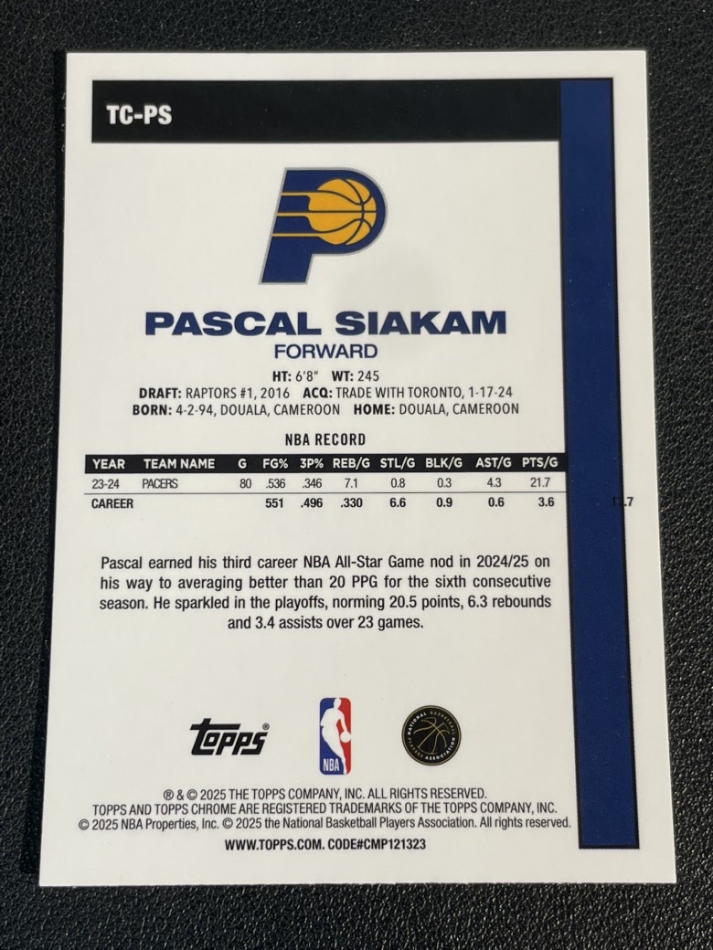 2025 Topps NBA Flagship Pascal Siakam 18 帕斯卡尔 西亚卡姆 步行者 1980复古 折射 青折 青mojo折 199编 实卡精美 卡品如图 尖叫代拍 白白