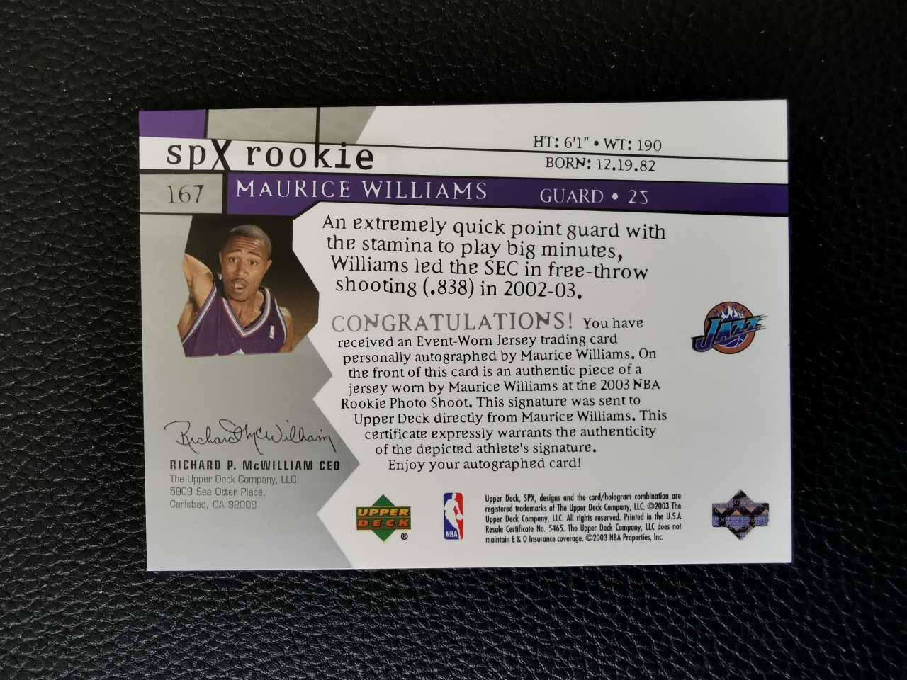 【金矿拍卖】2003 upper deck ud spx rookie 爵士新秀rc 莫里斯威廉姆斯 莫不传 naurice williams 签字 落场球衣切割 rja 1394/1999编 小天