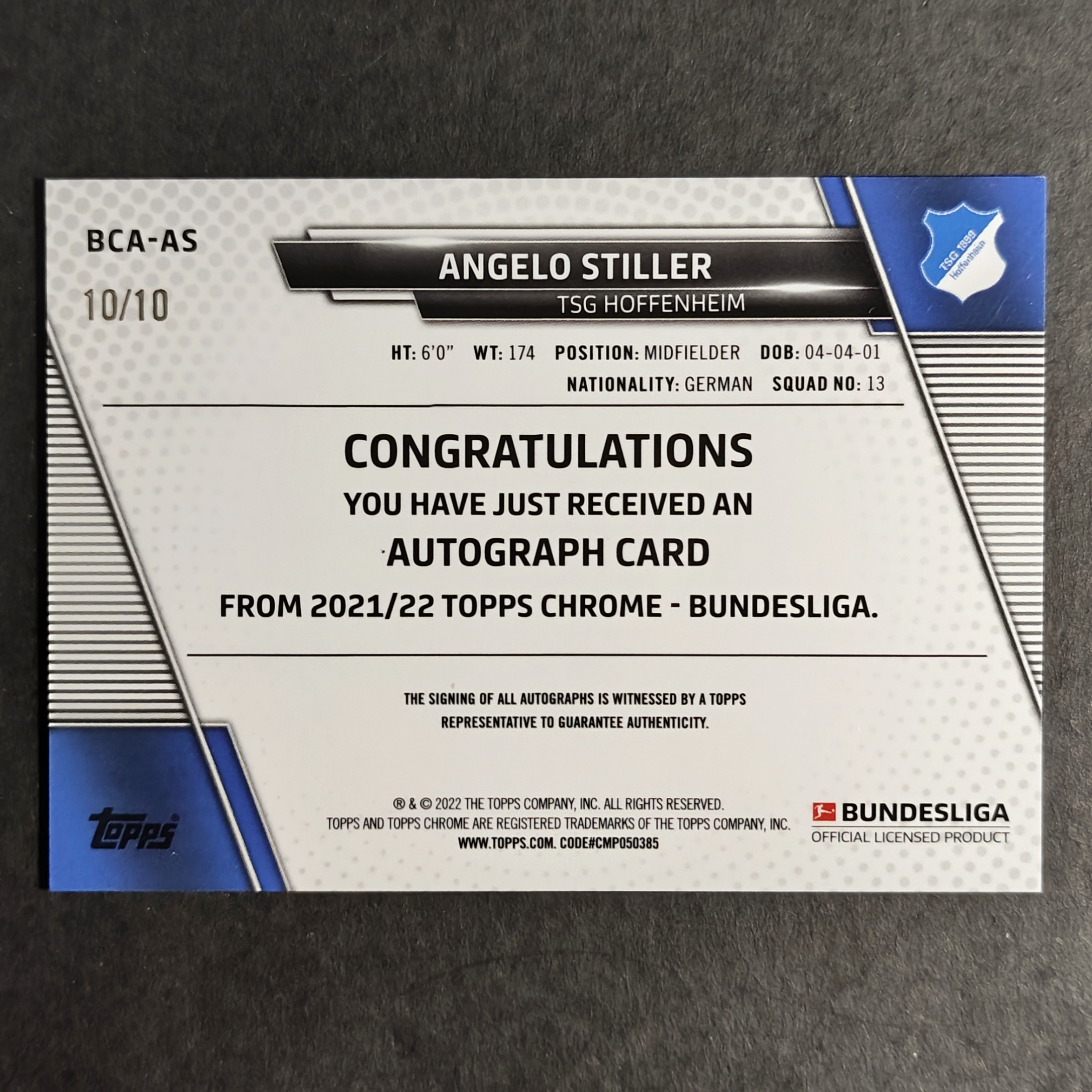 2021-22 Topps Chrome Angelo Stiller RC 施蒂勒 斯蒂勒/10编尾编签字红折黑折 德国德甲拜仁霍芬海姆斯图加特 阿森纳曼联皇马目标 克罗斯指定接班人比朔夫沃尔特马德