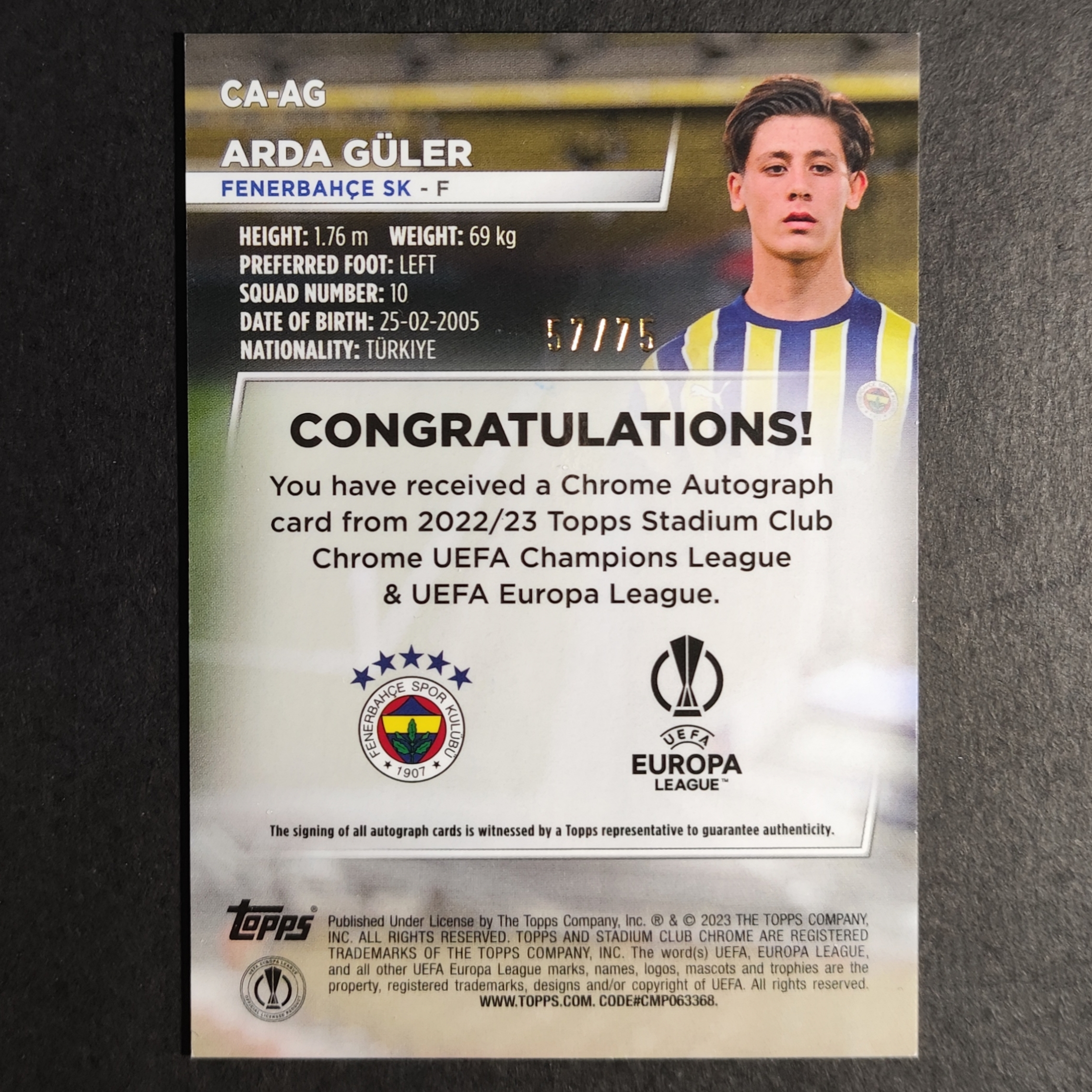 2022-23 Topps Stadium Club Chrome Arda Güler RC Guler 居莱尔/75编蓝折 唯二新秀签字系列竞技场梅林 费内巴切皇马皇家马德里 乌尊伊尔迪兹盗梦空间