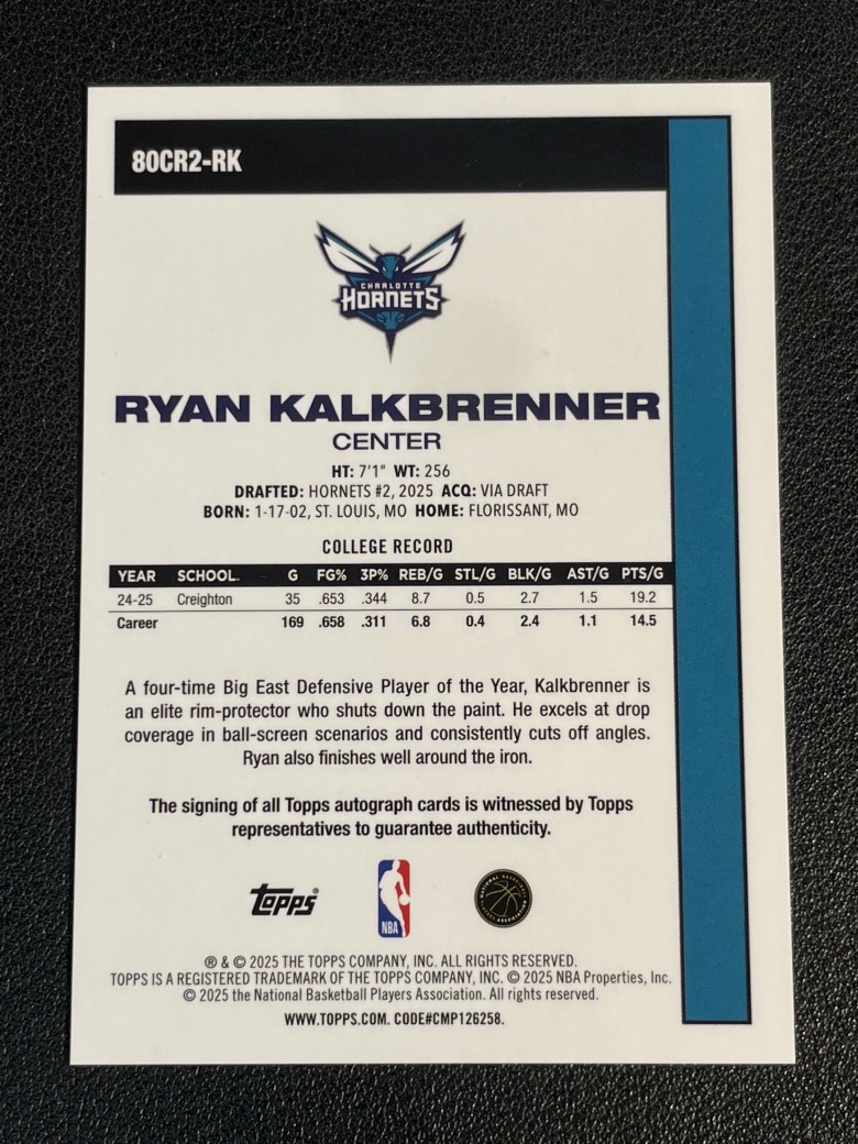 2025 Topps NBA Flagship Ryan Kalkbrenner RC 427 瑞安 卡尔克布伦纳 黄蜂 新秀 1980复古 折射 银mojo折 签字 卡签 卡品如图 pink
