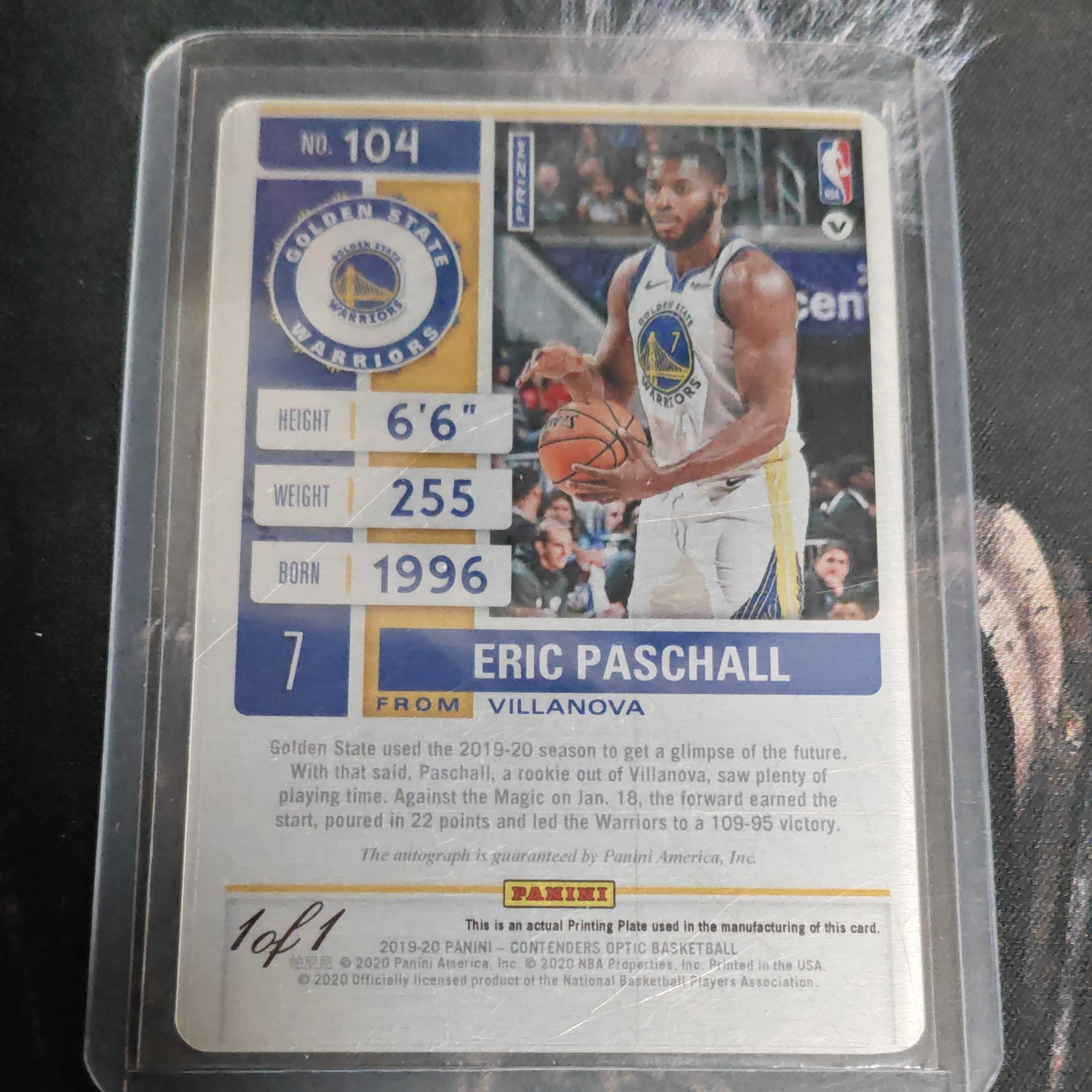 2019-20 Panini Contenders Optic Eric Paschall RC 勇士新秀 埃里克 帕斯卡尔 1/1 模板签 卡签 实卡帅气 品墨如图