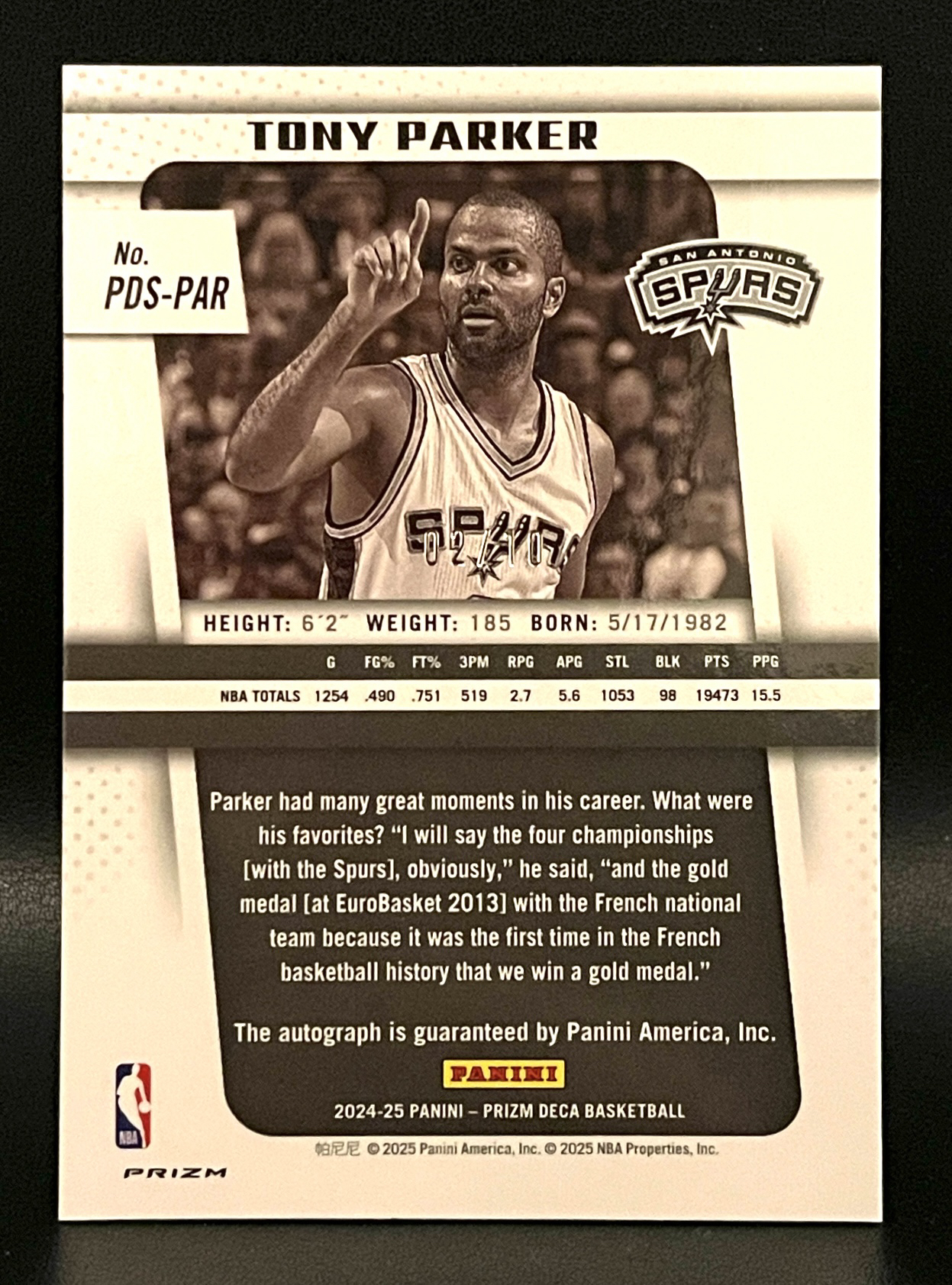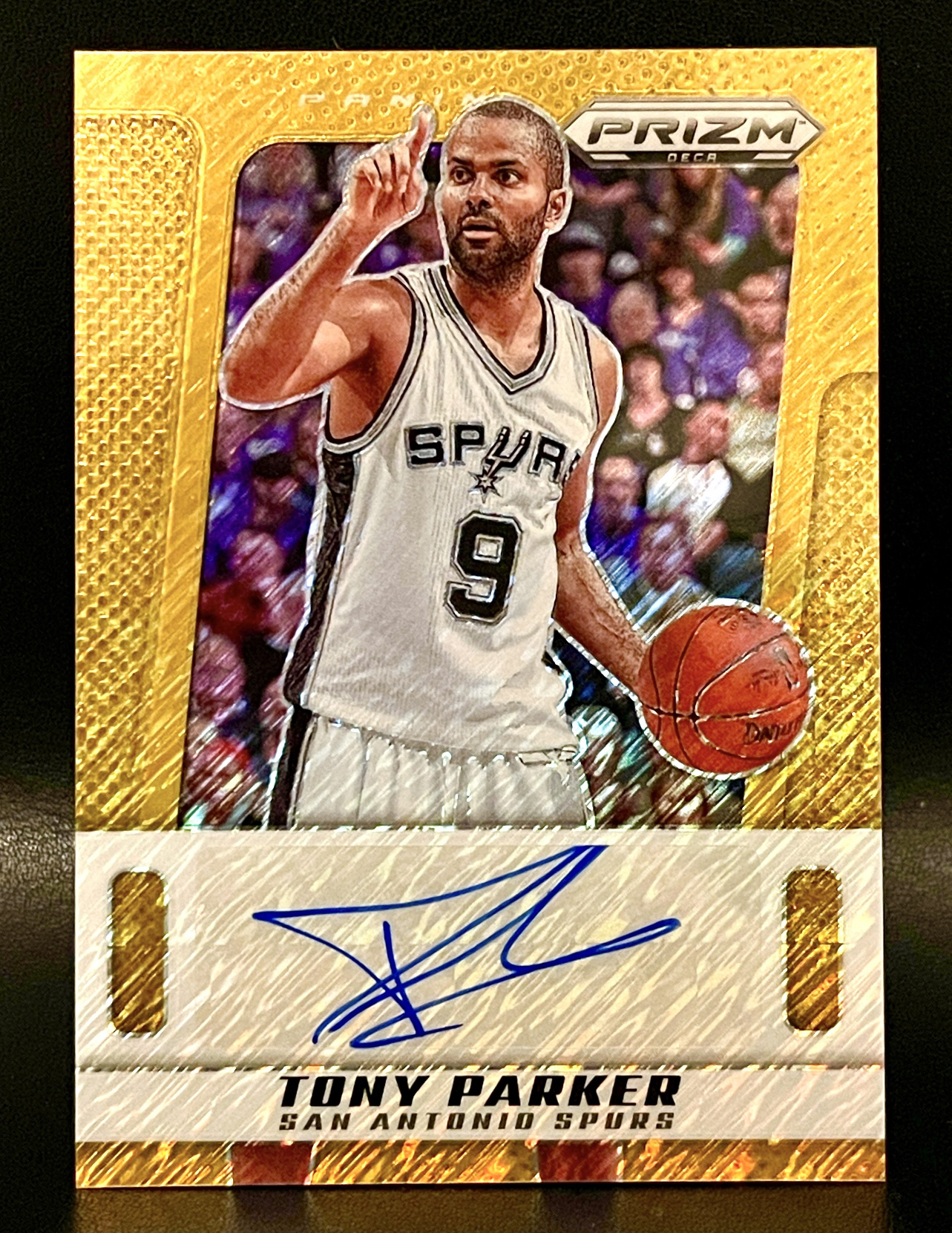 托尼帕克 法国跑车 2024 Panini Prizm Deca 02/10编 低编 金shimmer折 金折 折射非常漂亮 亲笔签名 蓝字 传奇签 马刺 邓肯吉诺比利队友 值得收藏!
