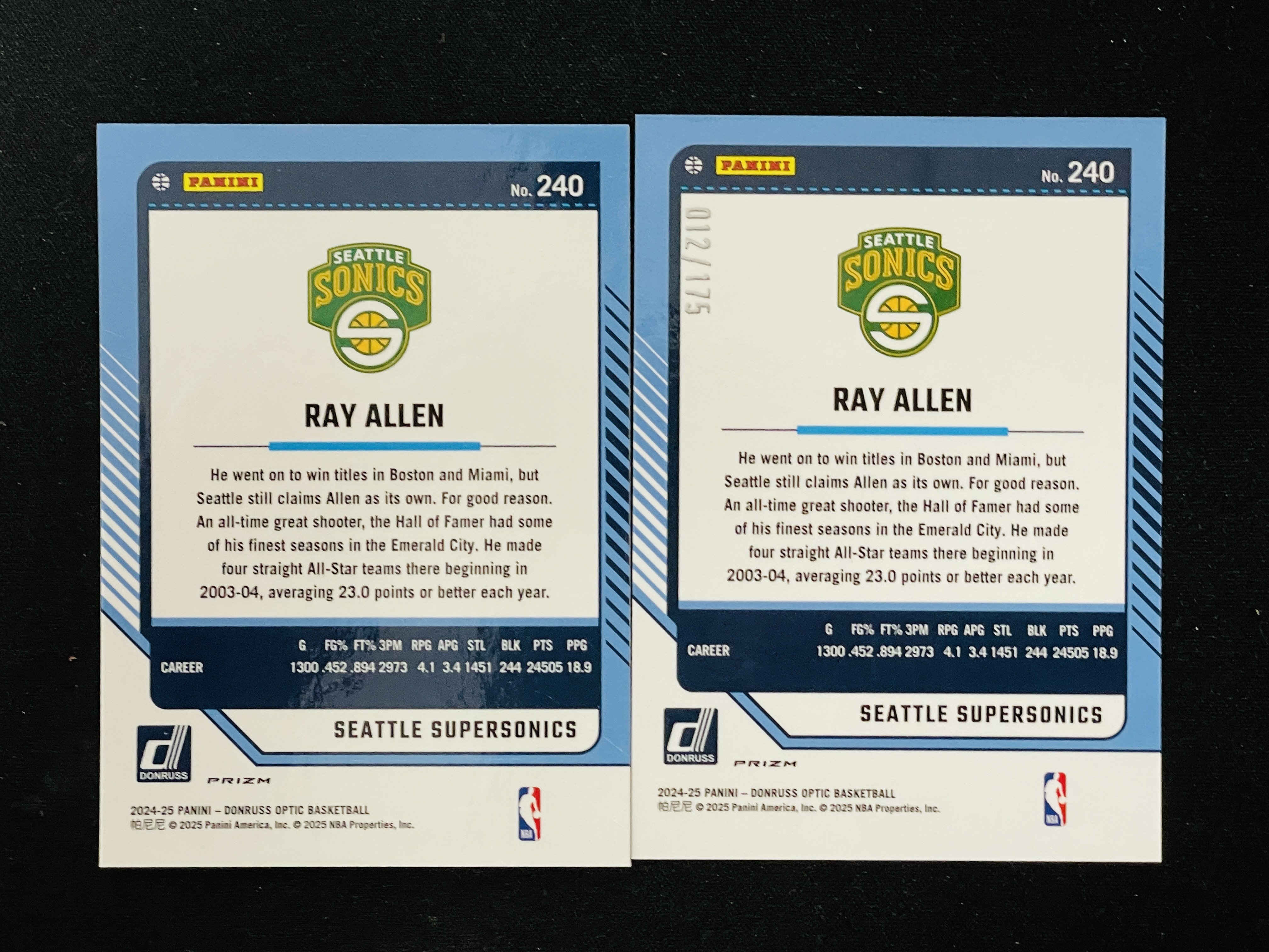 2024-25 Panini Donruss Ray Allen 【飞飞代卖】超音速 雷阿伦 君子雷 杜蕾斯op 橙折 175编 粉hyper折 折射 2张打包 专收凑套必备