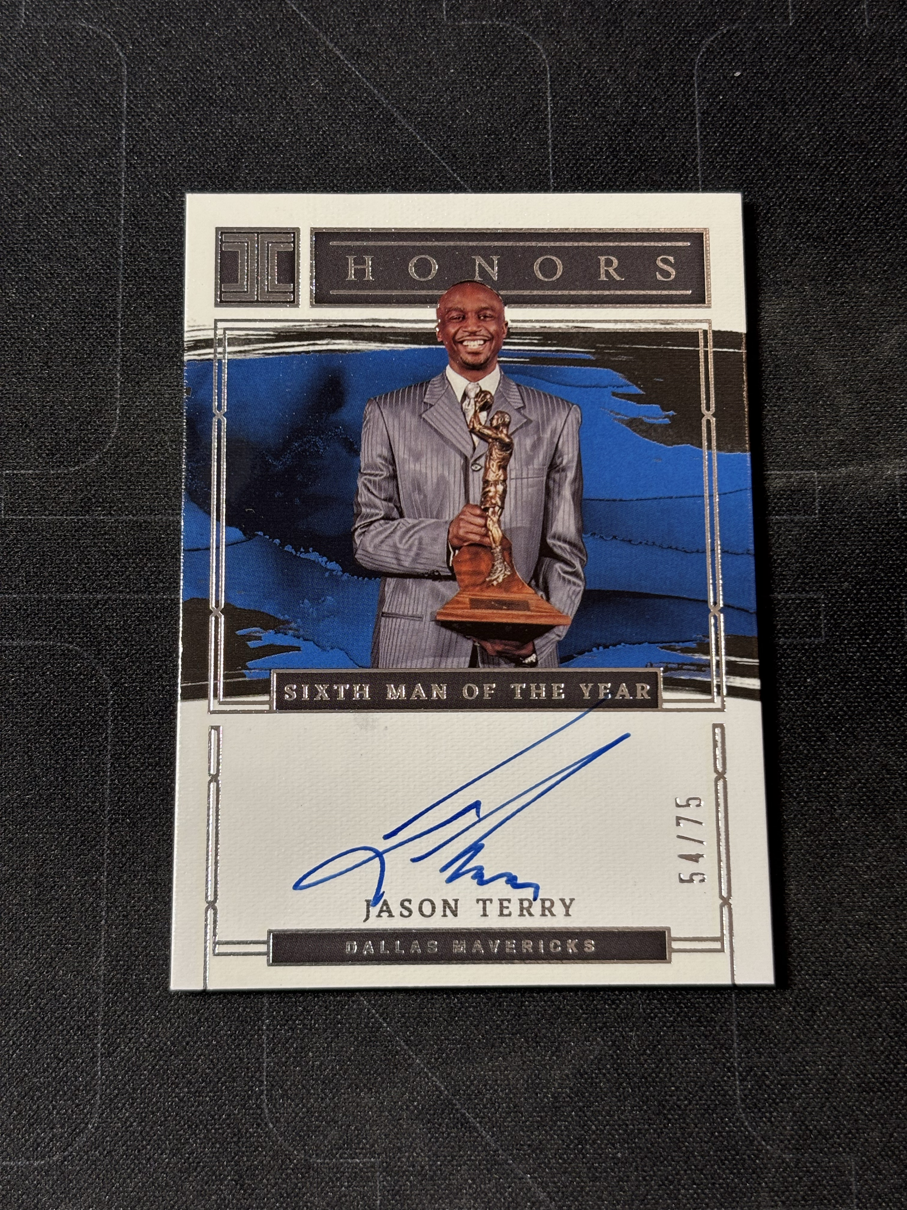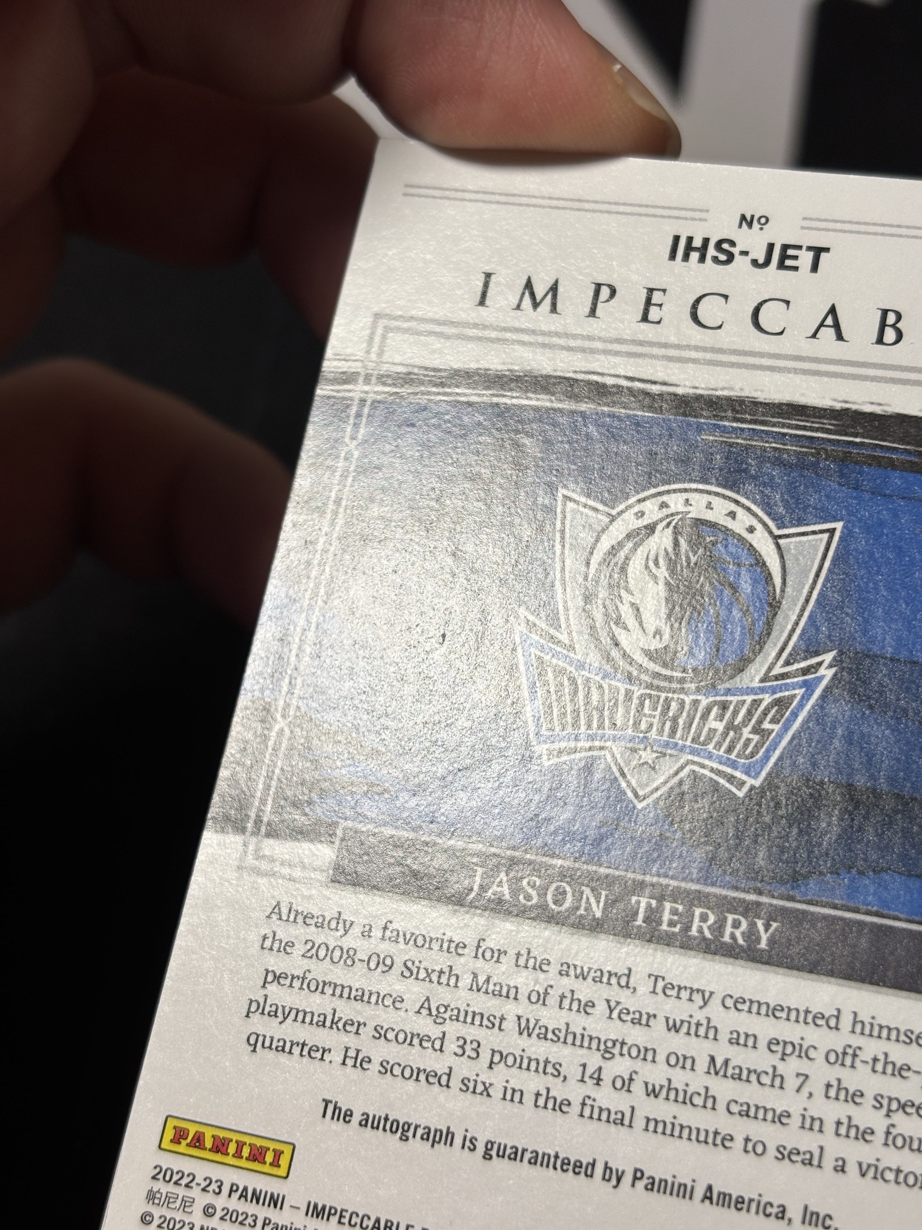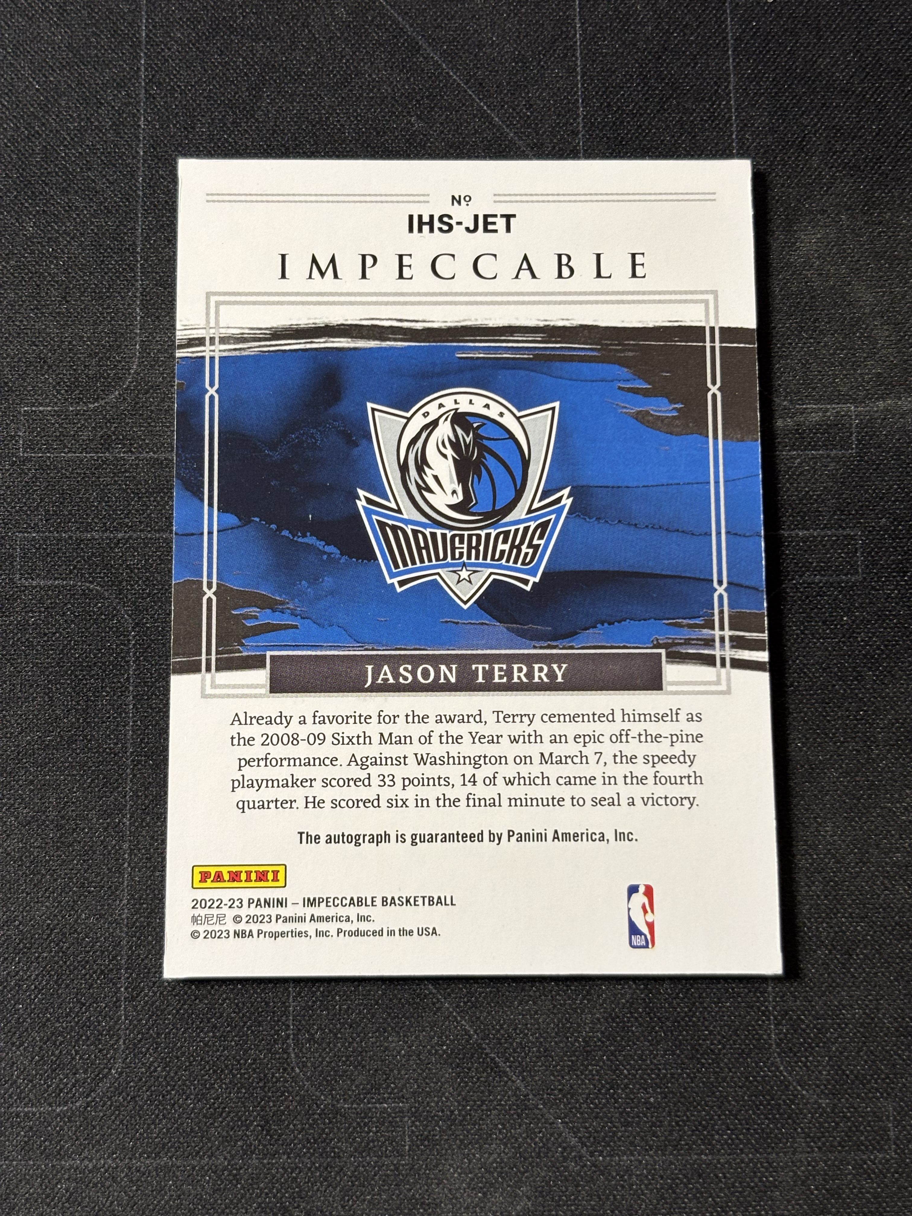 2022-23 Panini Impeccable Jason Terry 【香山代卖】贾森 特里 独行侠名宿 冠军功臣 小真金 54/75编 签字 卡签 荣耀签 最佳第六人 捧杯 奖杯 卡品微瑕如图