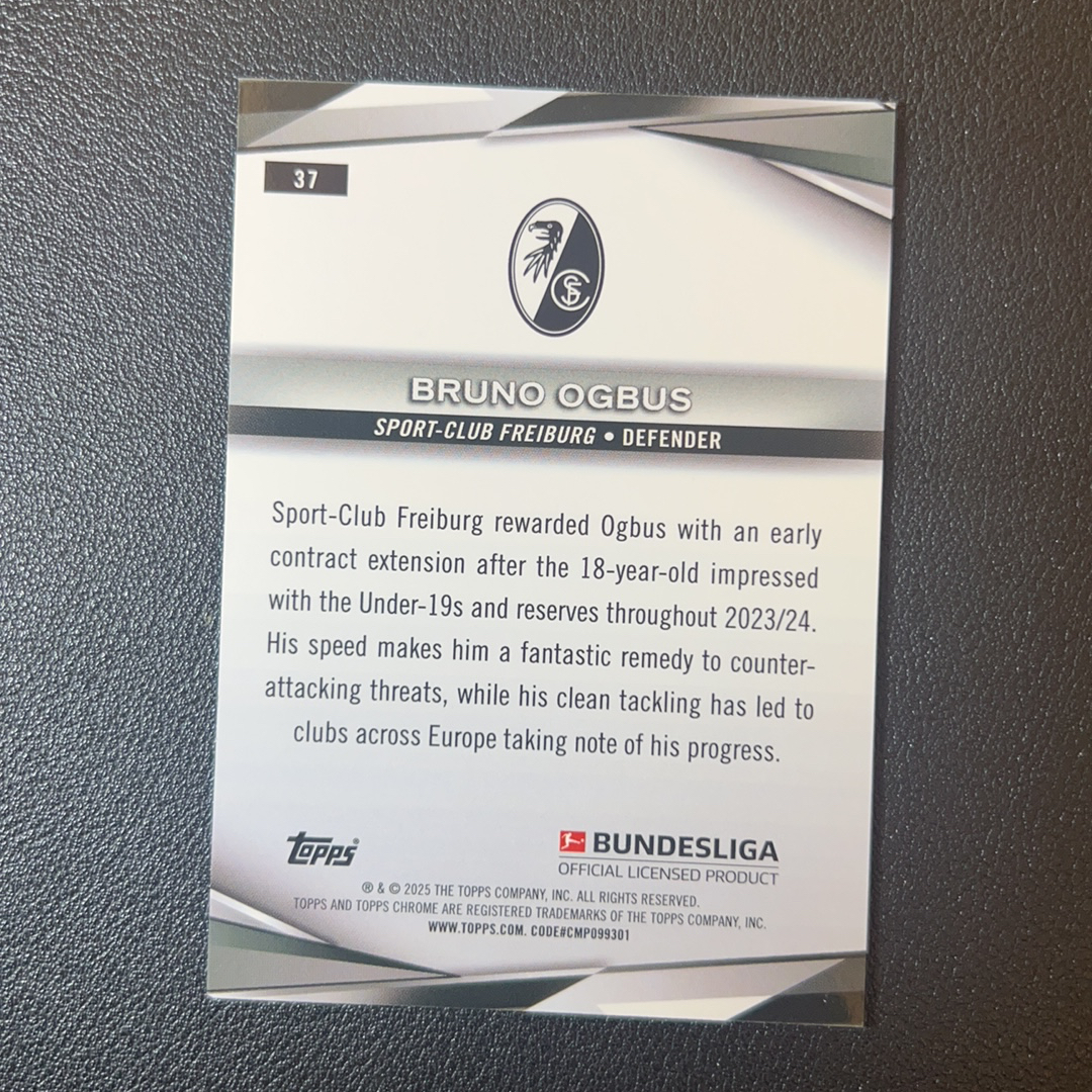 2024-25 Topps Chrome Bruno Ogbus RC 新秀 布鲁诺 奥布斯 瑞士 弗莱堡 05/25编 低编 橙折 Bundesliga 德甲TC 轻印-SY9117
