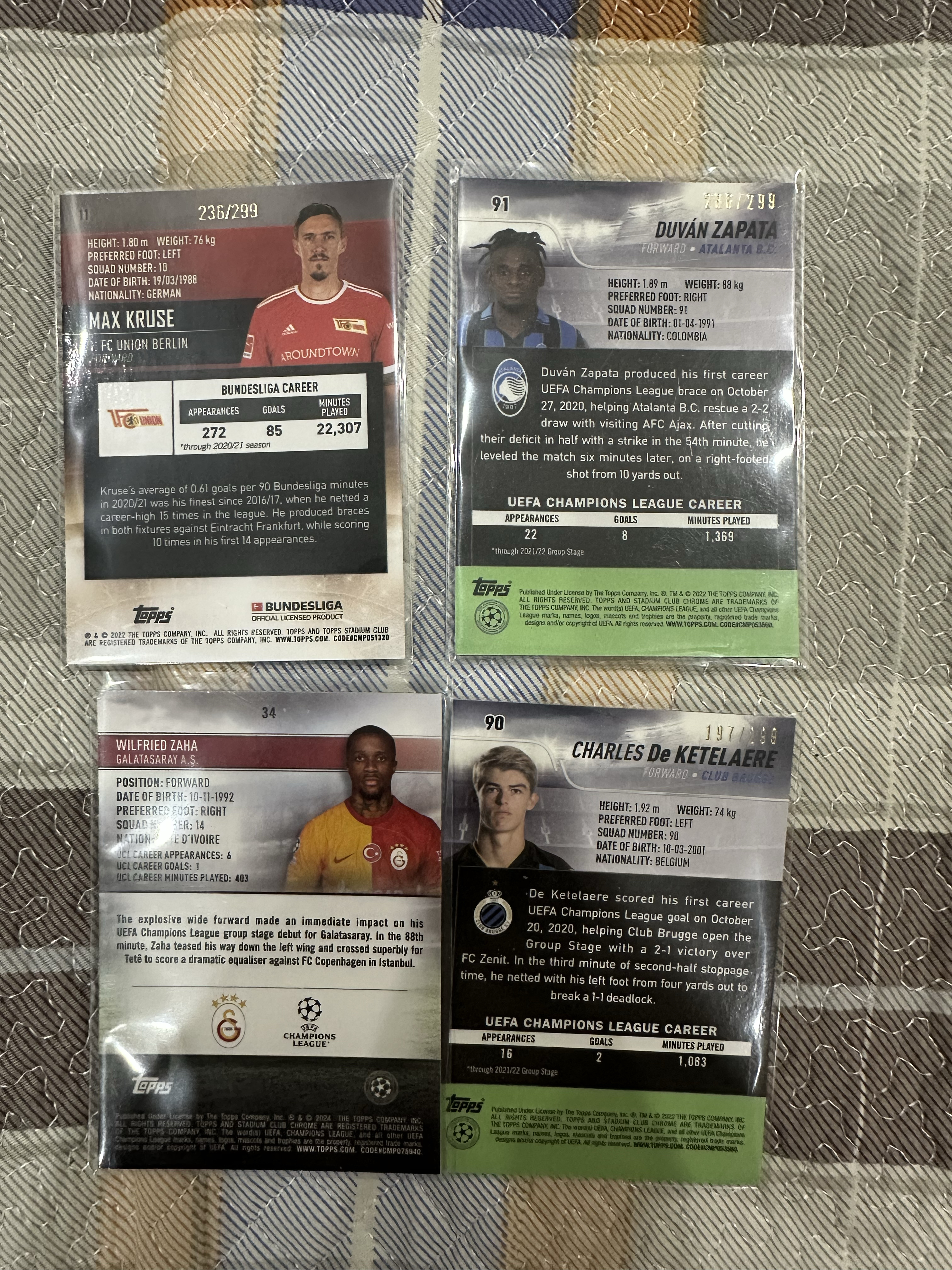 2022 Topps Stadium Club Chrome Charles de Ketelaere 欧冠 竞技场 cdk 德凯特莱尔 杜万萨帕塔 克鲁斯 扎哈 扎球王 299编 LOT 四张打包