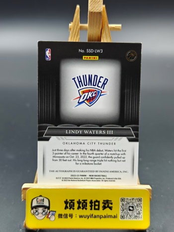 2.参拍:卡品墨迹如图所示(厚卡异形卡等都有正常白边白角,部分系列会有特殊瑕疵),请认真看图后再谨慎出价。不接受任何艺术家买卡,如拍到卡后有任何艺术家行为(包括但不限于在通行卡品里挑瑕疵索要赔偿或退卡等)一律拉黑投诉处理。所卖卡未经描述均为通行品,可能会有细微瑕疵;打包标小卡可能会有不同程度的瑕疵,不保障卡品;评级卡壳和原封砖的磨损不包含在卡品范围内;多张上拍卡品通行的同款卡片随机发货。竞拍前可以私聊要细节图,成交后再以有瑕疵、勿拍等理由退卡的一律拒绝,介意者请勿参拍!参拍即视为已读同意!