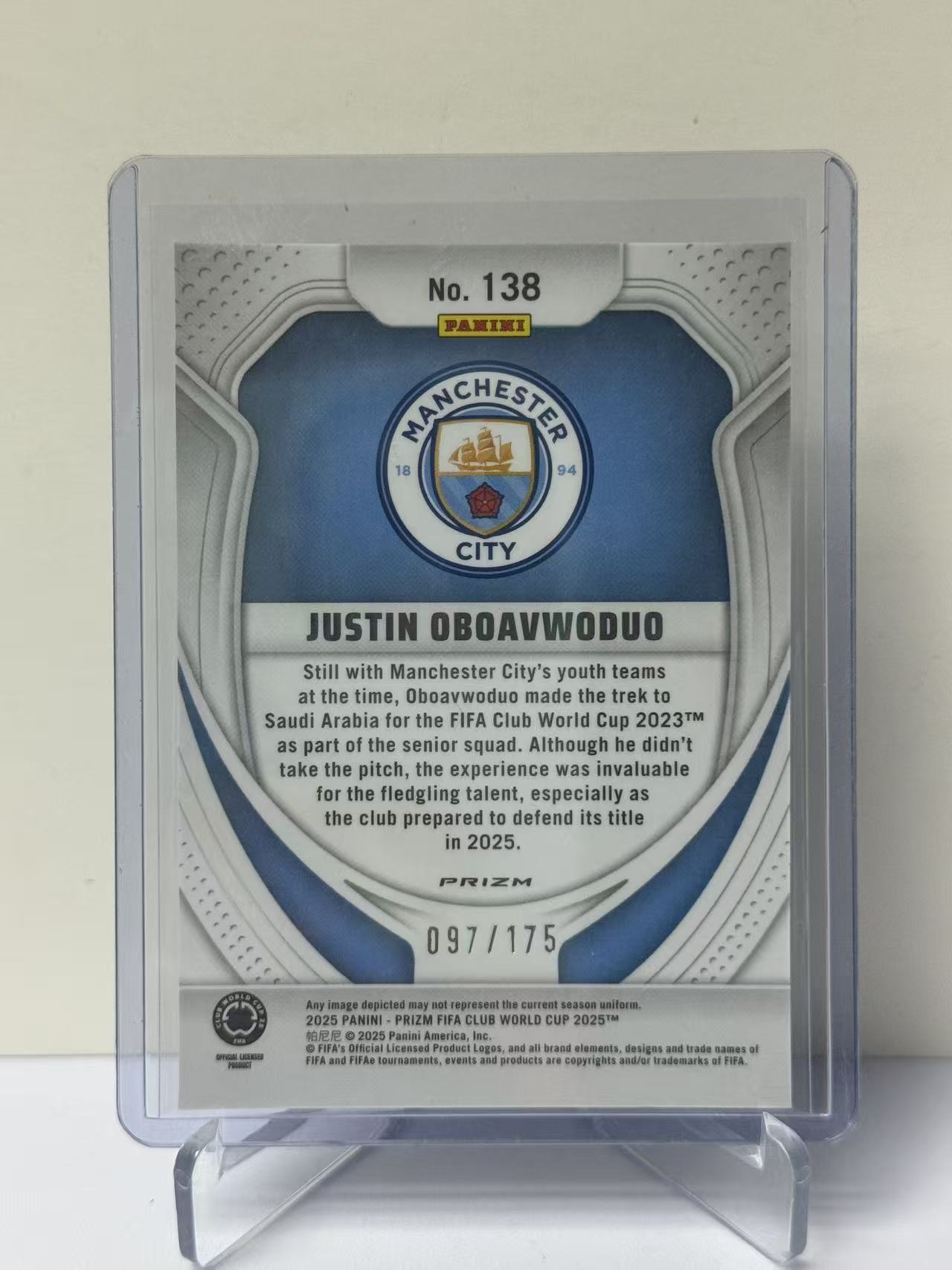 2025 Panini Prizm Justin Oboavwoduo RC 世俱杯PZ 曼城 曼切斯特城 奥博阿夫沃多 RC新秀 蓝碎冰折 97/175编 收藏必备 卡品如图 9527