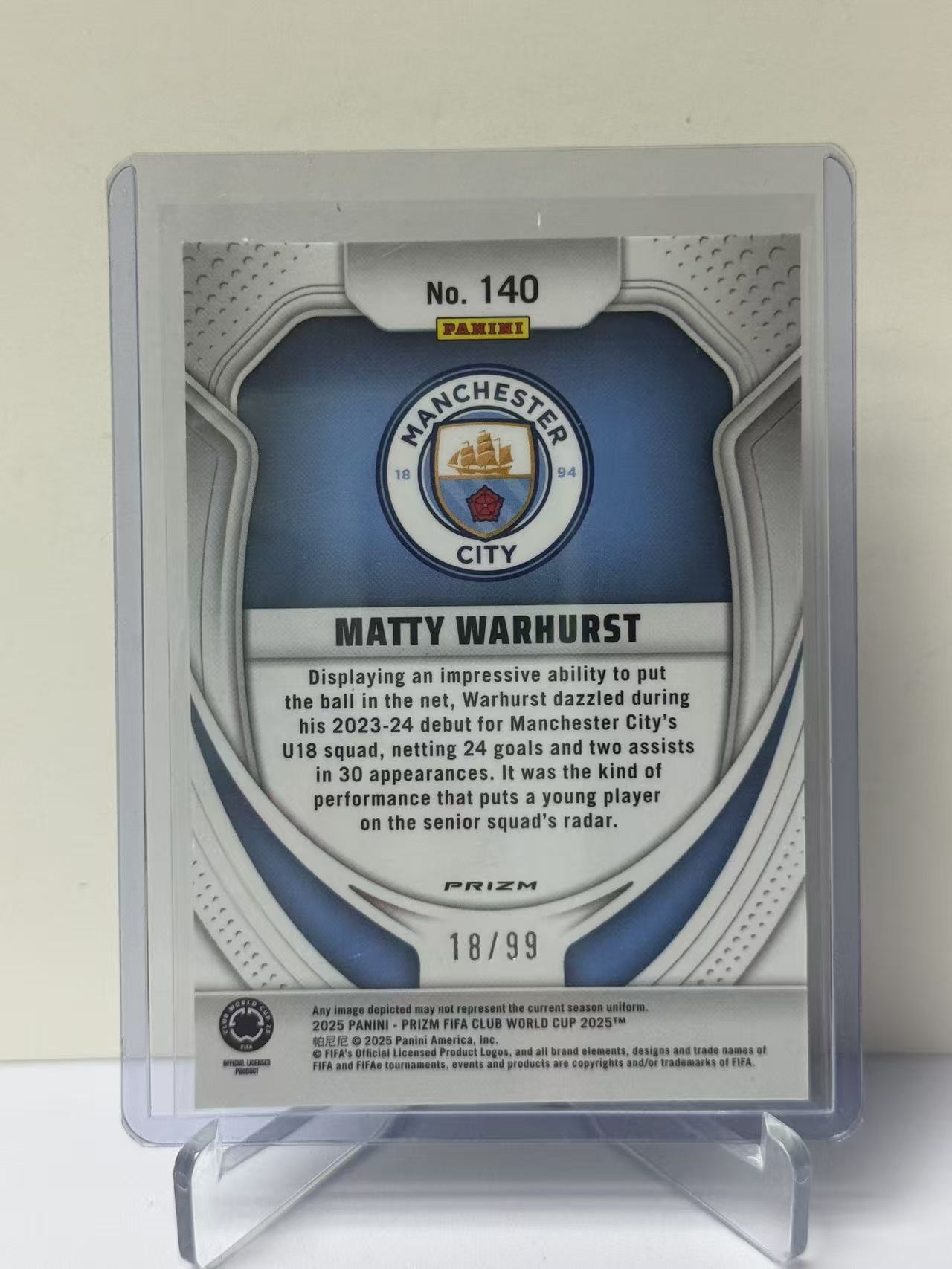 2025 Panini Prizm Matty Warhurst RC 世俱杯PZ 曼城 曼切斯特城 沃赫斯特 RC新秀 青折 18/99编 收藏必备 卡品如图 9527