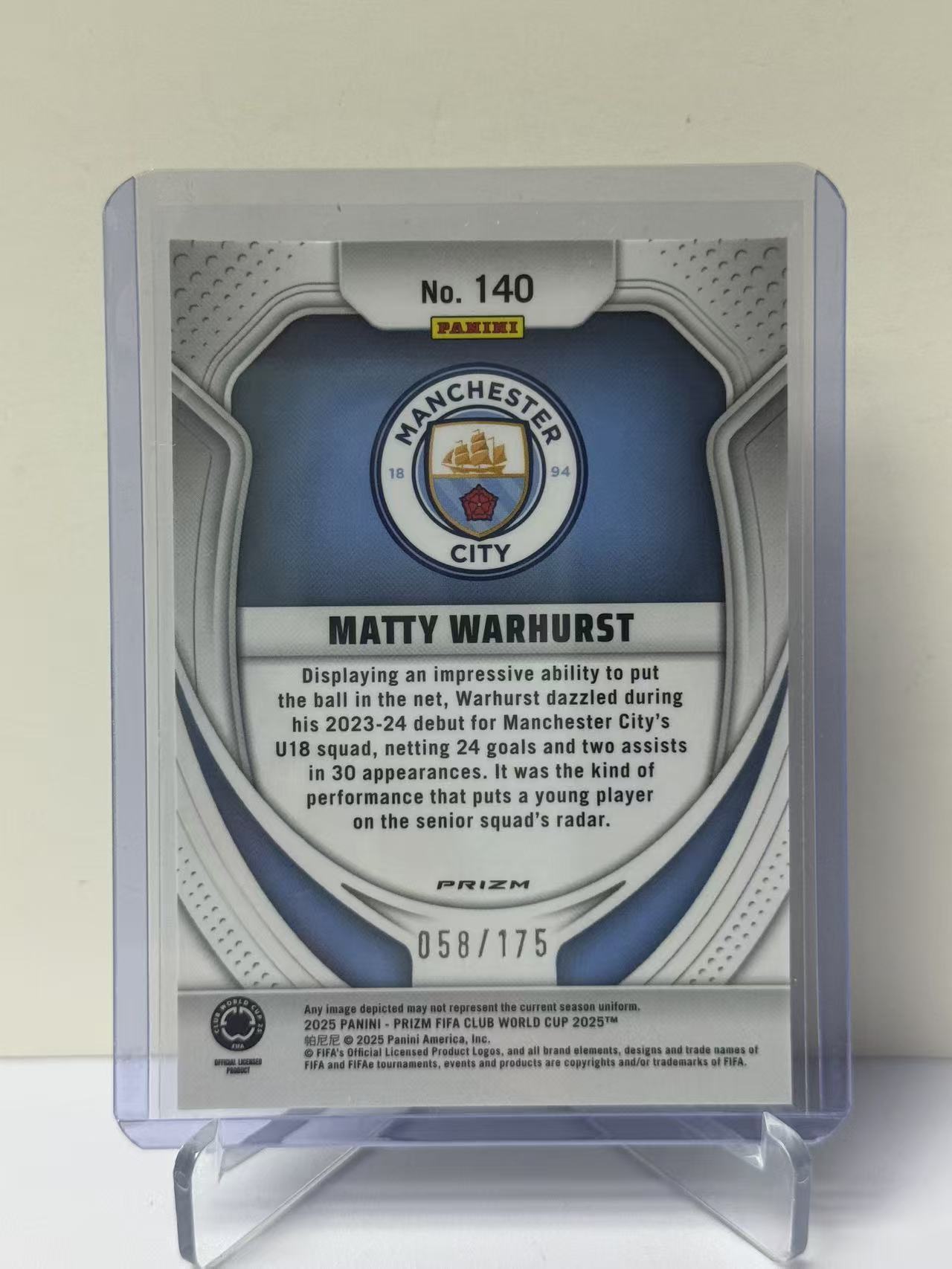 2025 Panini Prizm Matty Warhurst RC 世俱杯PZ 曼城 曼切斯特城 沃赫斯特 RC新秀 蓝碎冰折 58/175编 收藏必备 卡品如图 9527