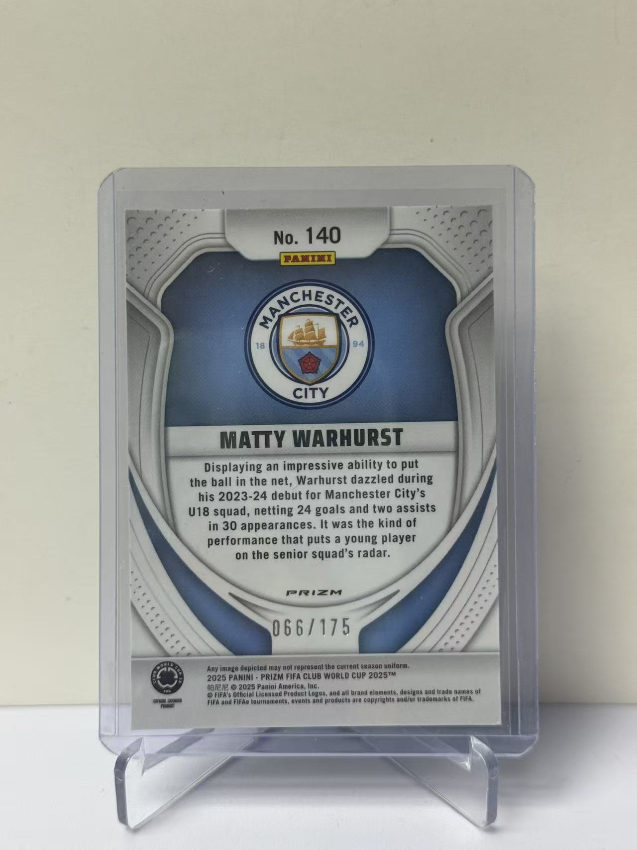 2025 Panini Prizm Matty Warhurst RC 世俱杯PZ 曼城 曼切斯特城 沃赫斯特 RC新秀 蓝碎冰折 66/175编 收藏必备 卡品如图 9527