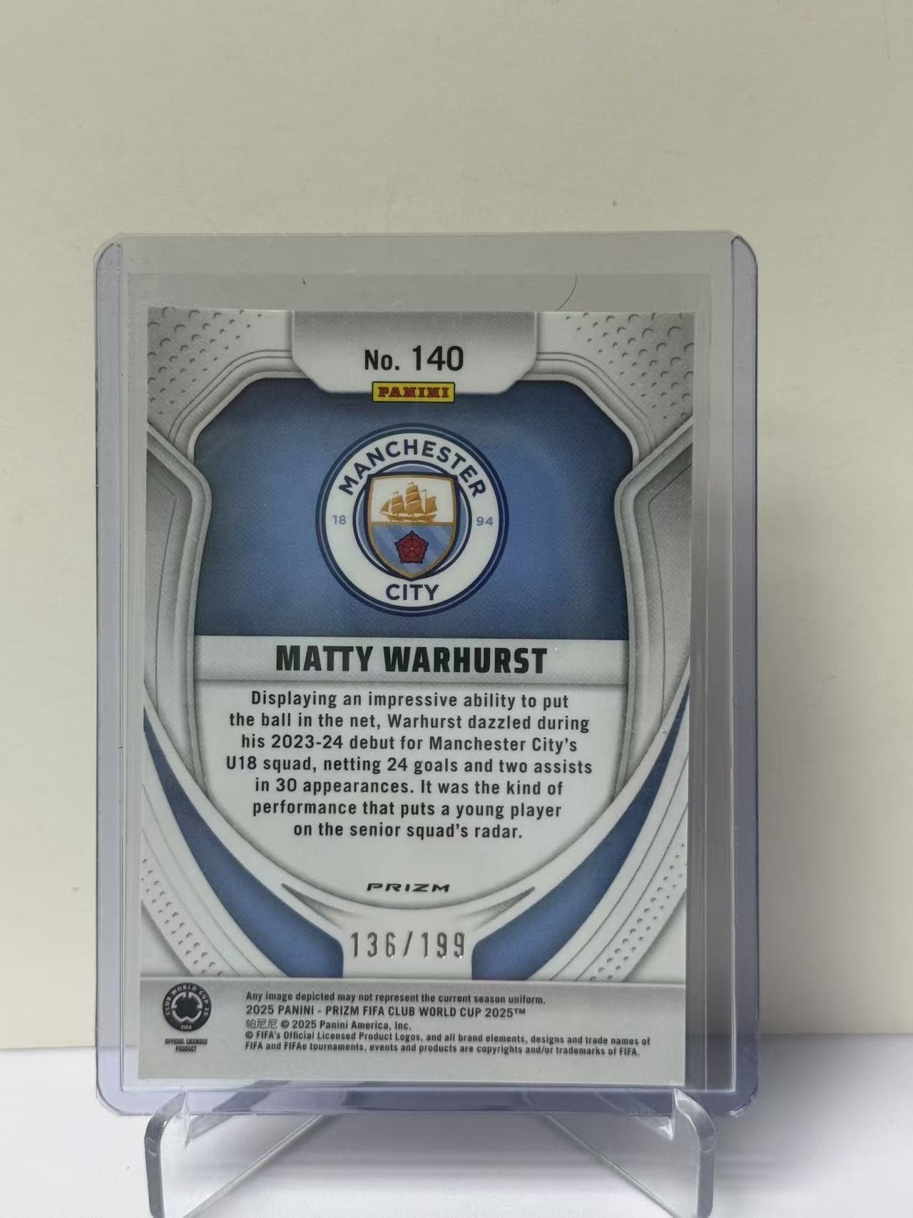 2025 Panini Prizm Matty Warhurst RC 世俱杯PZ 曼城 曼切斯特城 沃赫斯特 RC新秀 红折 136/199编 收藏必备 卡品如图 9527