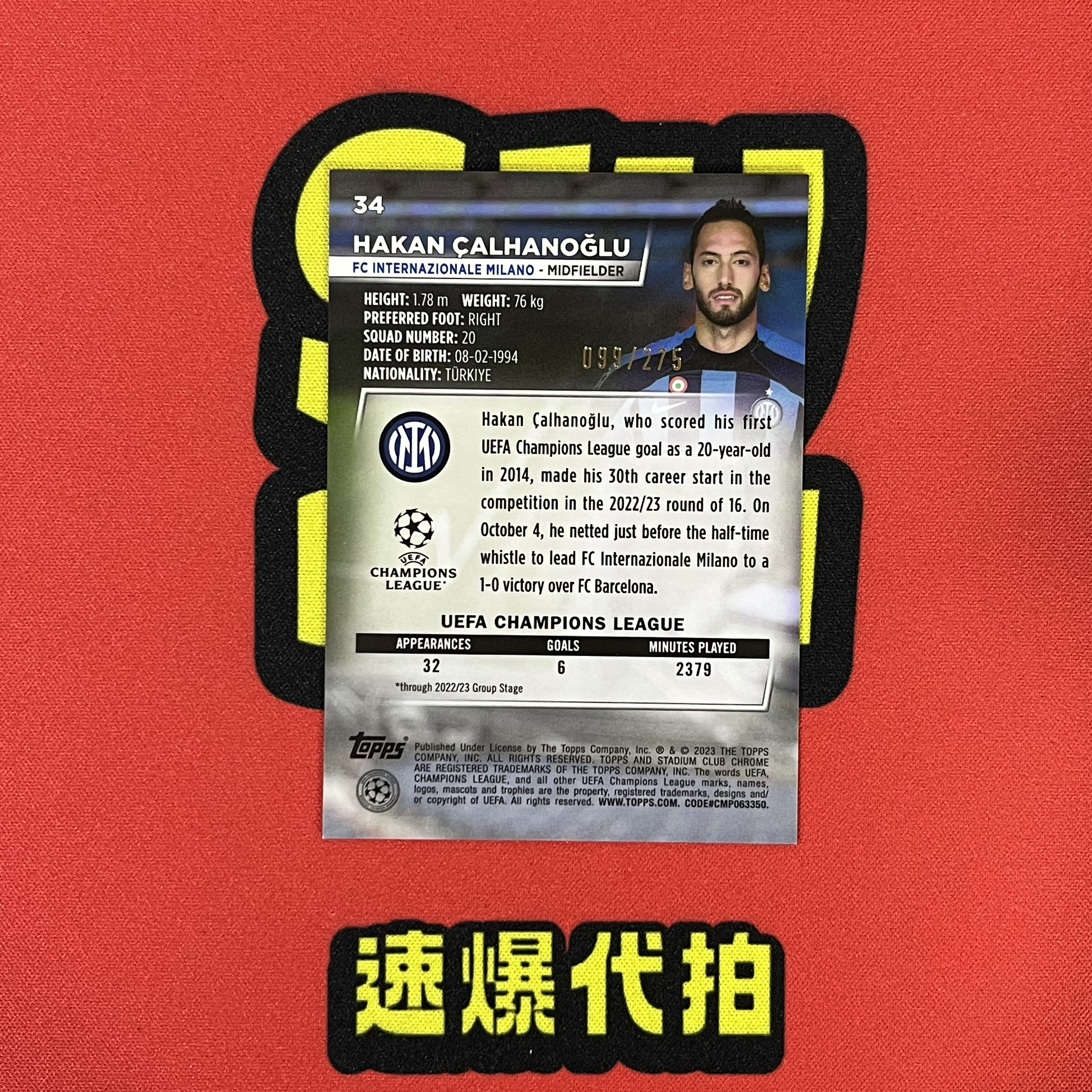 2022-23 Topps Chrome Hakan Calhanoglu 意甲 国际米兰 恰尔汗奥卢 竞技场 099/275编 绿波纹折 卡品如图 rios 【速爆代拍】